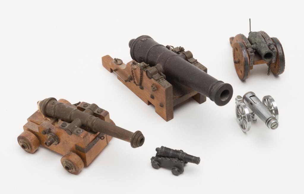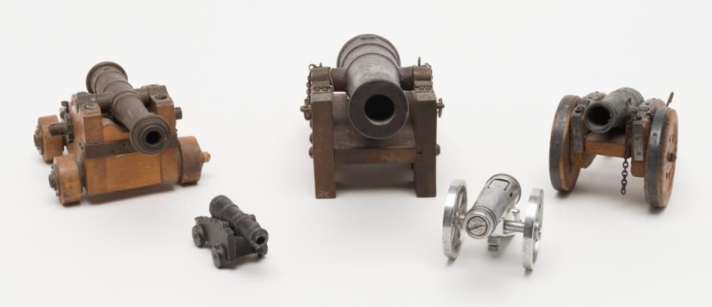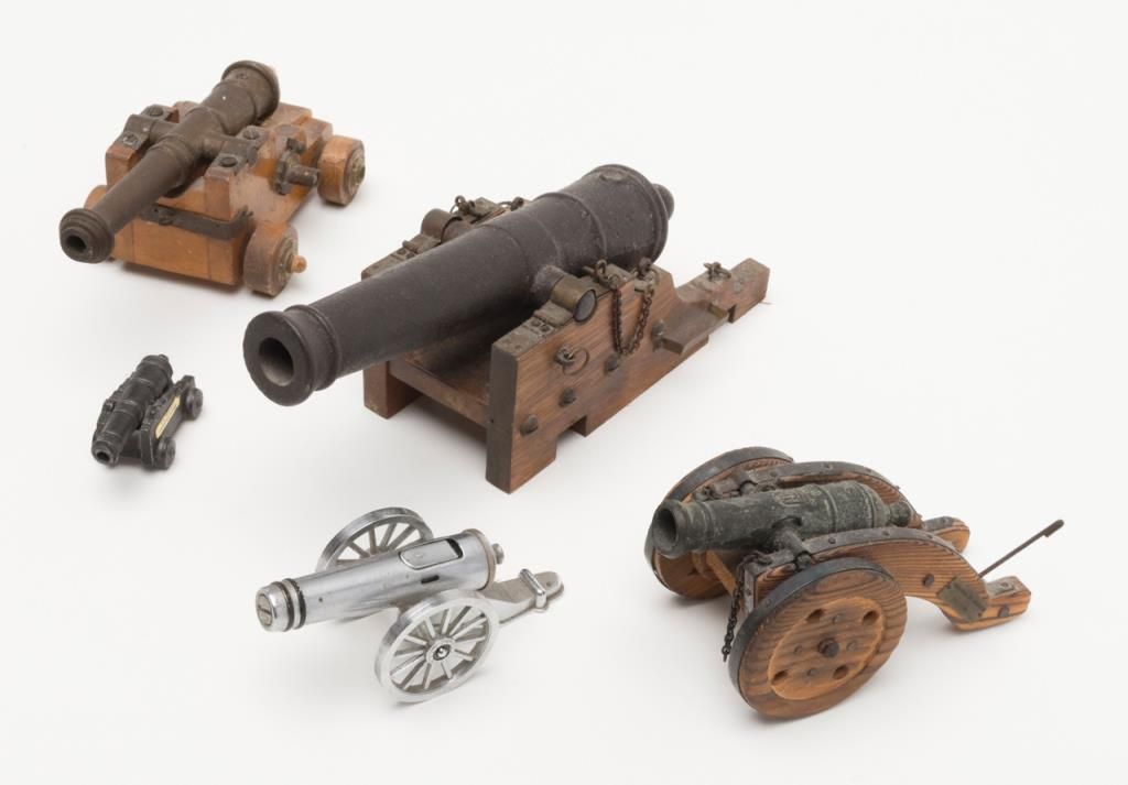 Lot of 5 misc. small cannons as decorators; pre-war to 1960s, different styles; one conceals a lighter. Est.: $150-$300.