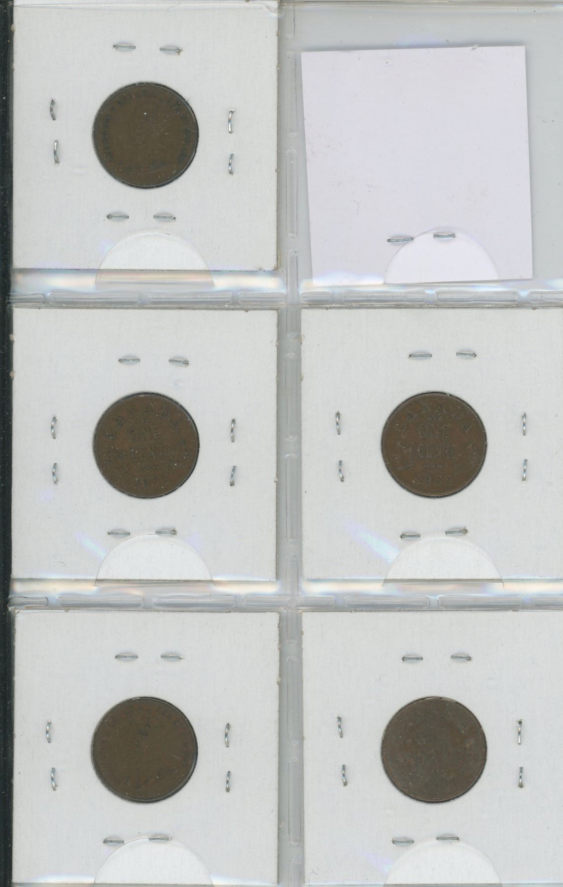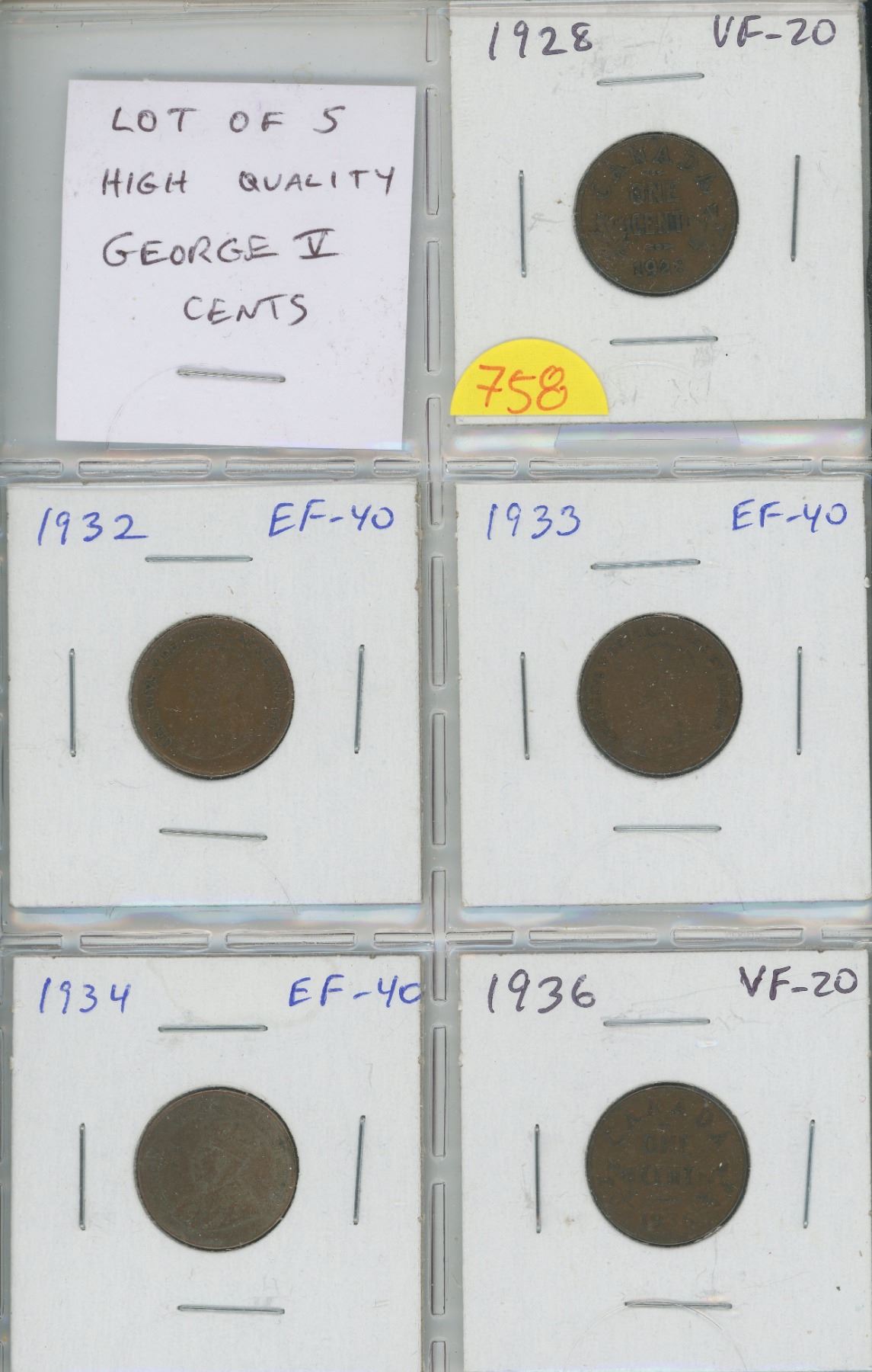 Lot of 5 nice quality George V small cents: 1928 VF-20; 1932 EF-40; 1933 EF-40; 1934 EF-40; 1936 VF-20.