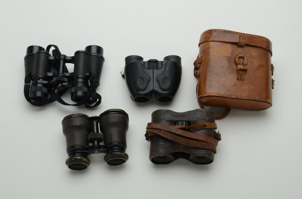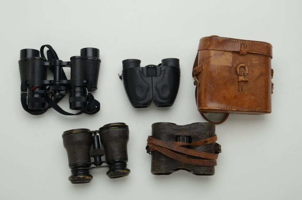 Lot of 5 pair of misc. binoculars, some WW II era. Est.: $100-$150.