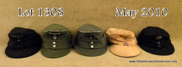 Lot of 5 various German armed forces M43 field caps. All caps retain their original insignia and are fully lined. In good to very good condition. Including Panzer and field police caps. Est: $900 - $1,800