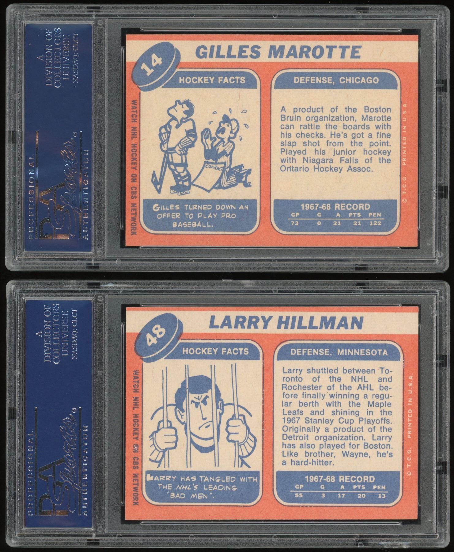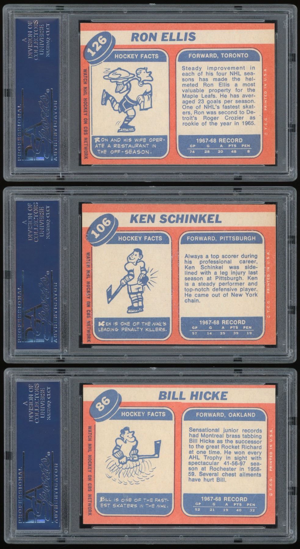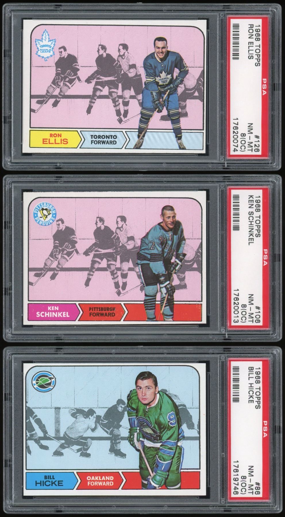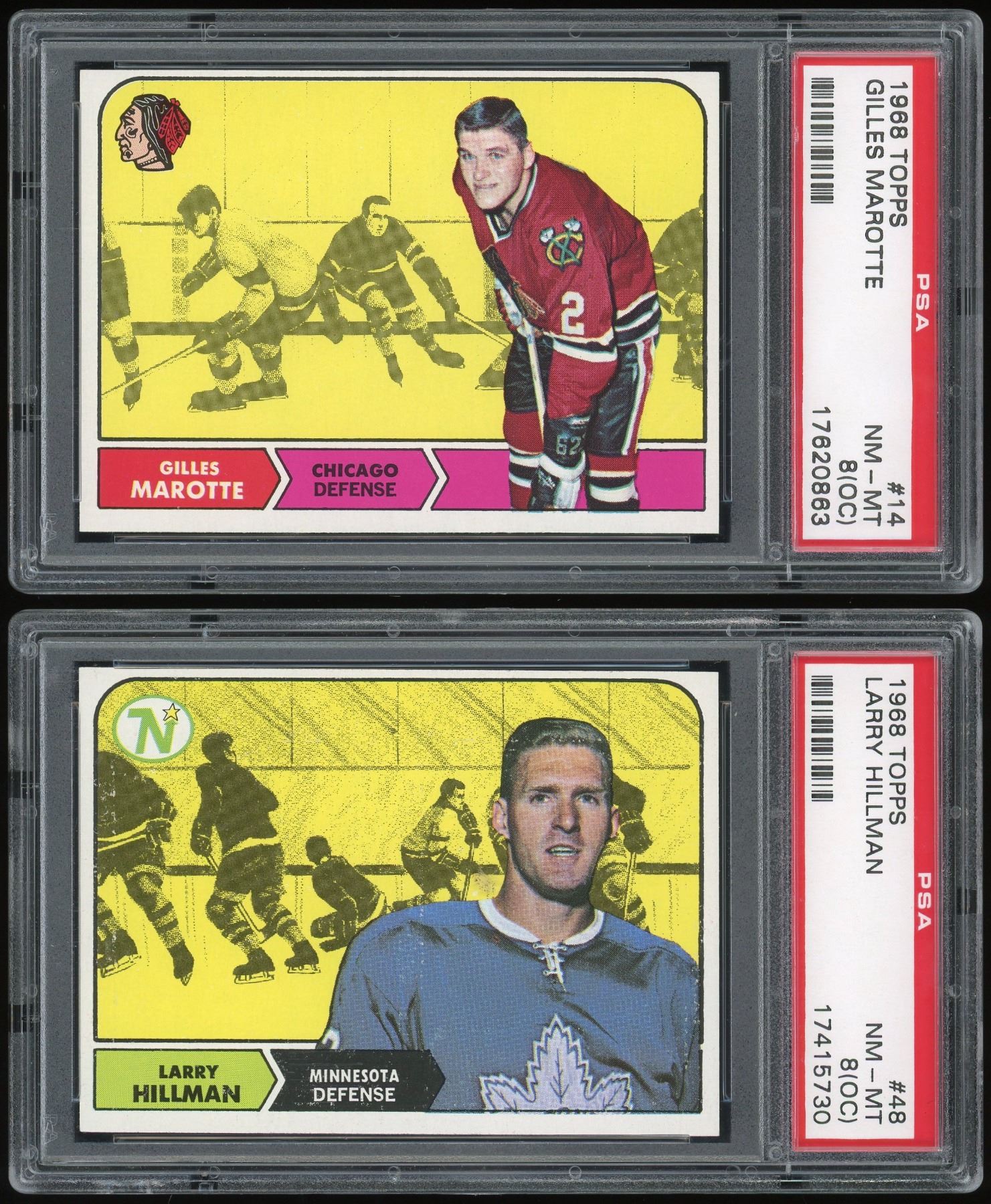 This lot consists of five PSA-graded 8 NM-MT cards from the 1968-69 Topps hockey set, includes #14 Gilles Marotte, #48 Larry Hillman, #86 Billy Hicke, #106 Ken Schinkel, and #126 Ron Ellis. All have a qualifier "OC" for off-center, but seems a little like overkill (there are thousands of PSA graded cards with similar centering that do not carry a qualifier).