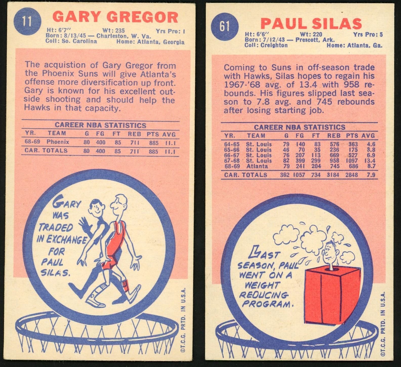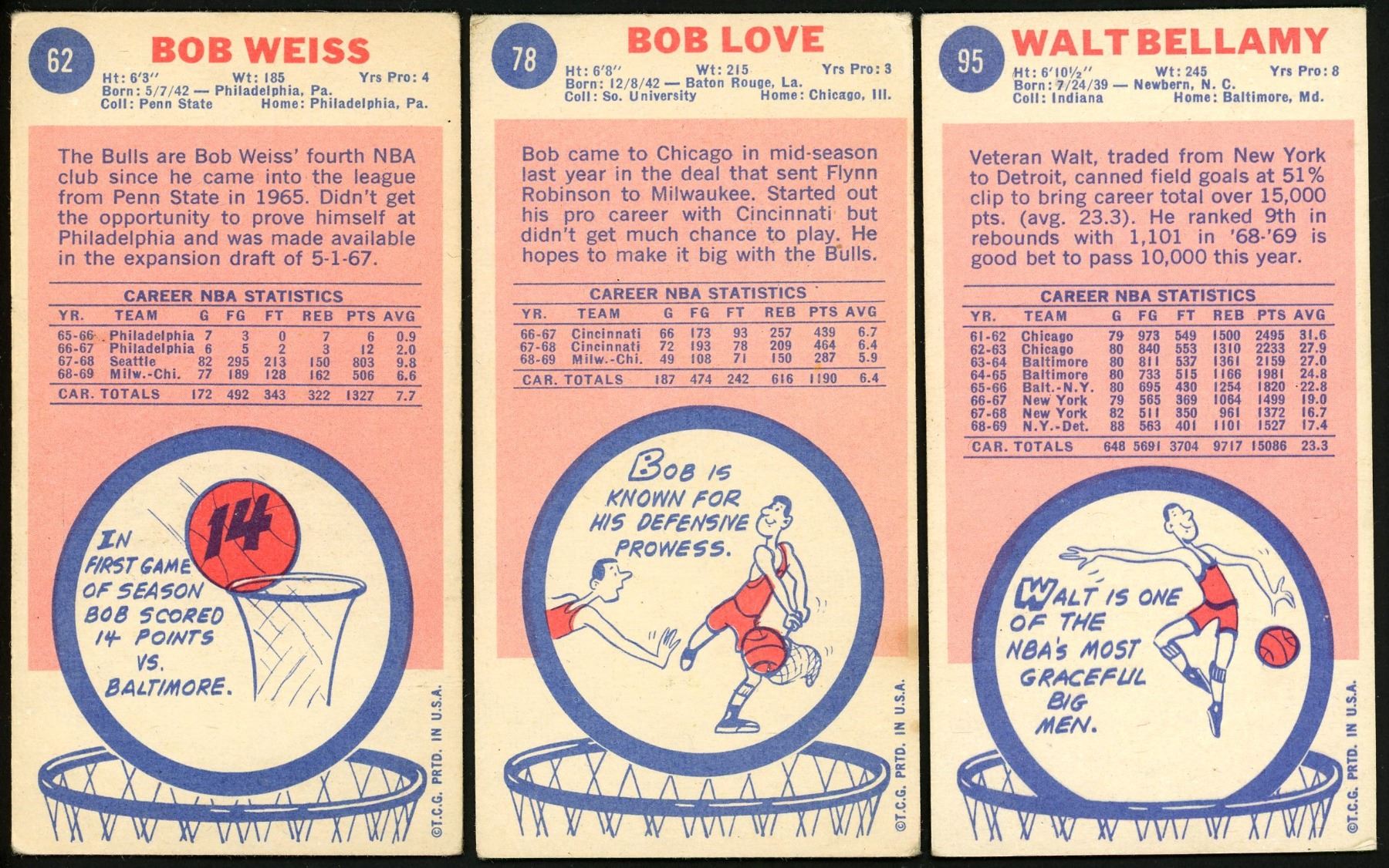 This lot contains five different cards from the classic 1969-70 Topps basketball set, grading VG to EX, includes: #11 Gary Gregor (VG), #61 Paul Silas RC (VG-EX+), #62 Bob Weiss RC (VG), #78 Bob Love RC (VG-EX), #95 Walt Bellamy* (EX). * denotes Hall of Famer.