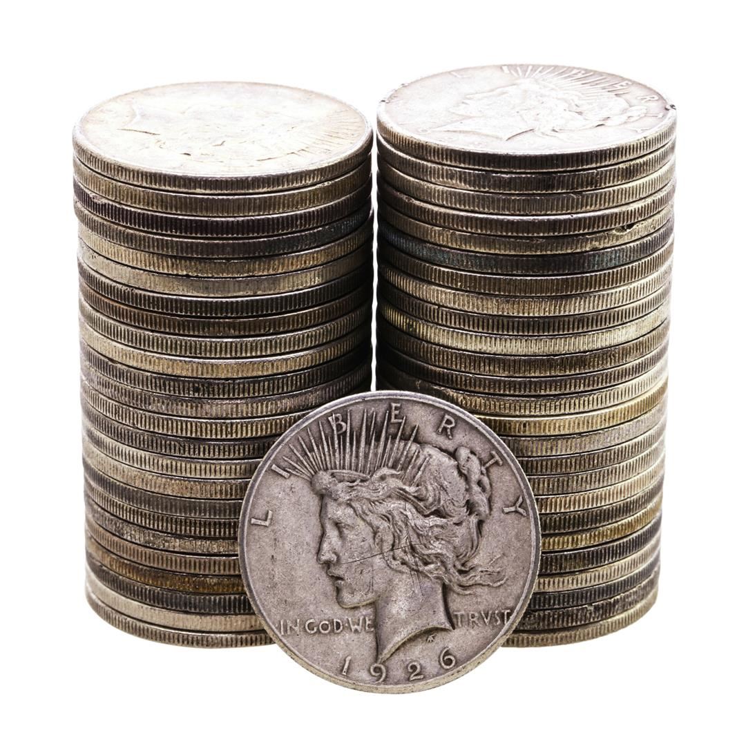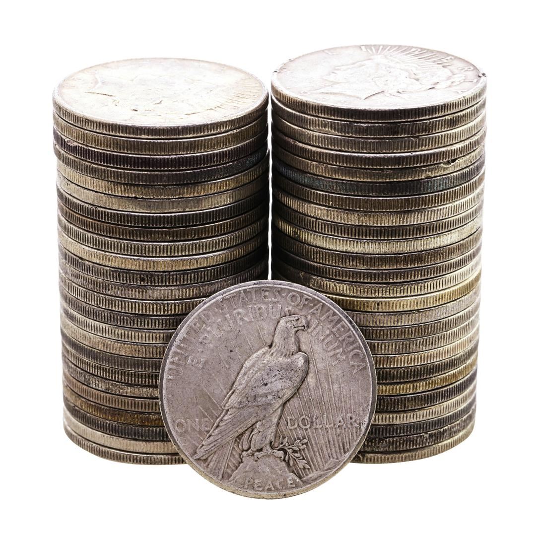 One Lot of (50) $1 Peace Silver Dollar Coins.
