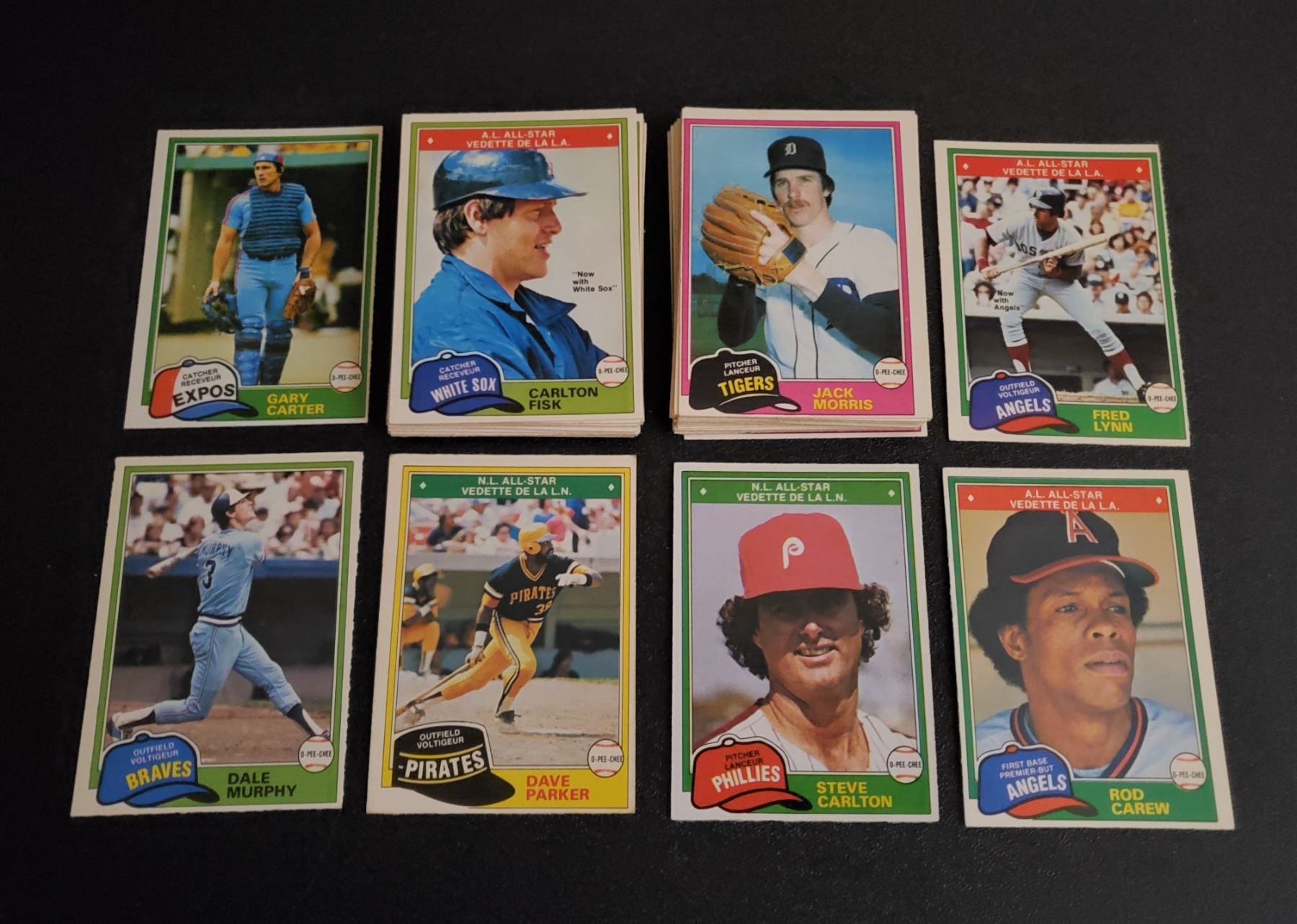 This lot consists of 51 Hall of Famers and star cards from the 1981 O-Pee-Chee baseball set. Grades mostly EX-MT, some less, some better! Includes among others: Carew, Carlton, D. Murphy, Parker, Lynn, Rice, Morris, Fidrych, Niekro, Fisk, Garvey, Gossage, Sutter, Stargell, Carter and more.