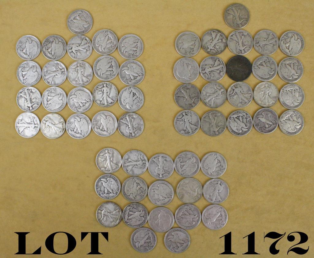 Lot of 57 walking-liberty fifty-cent pieces, various dates, circulated. Est: $250 - $500