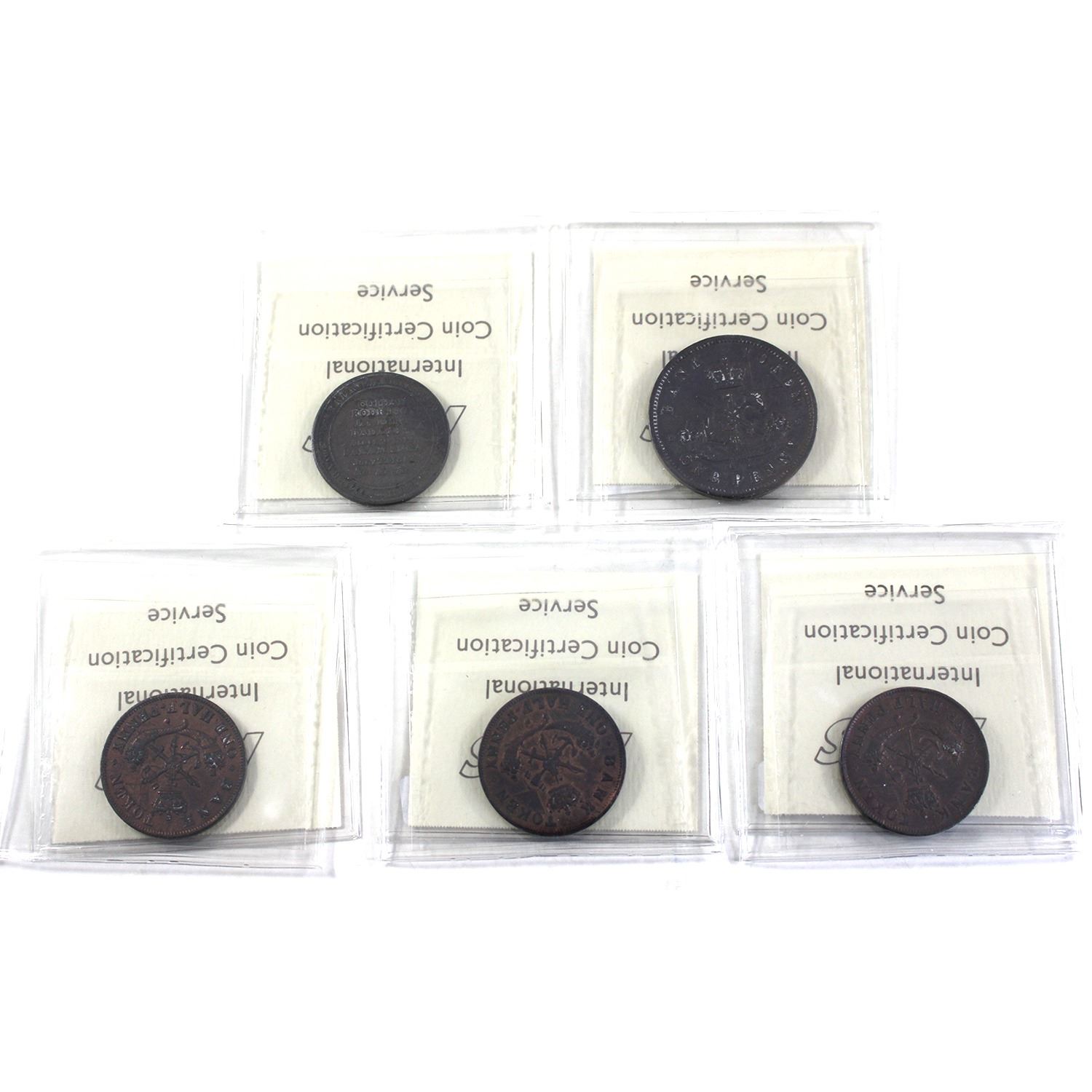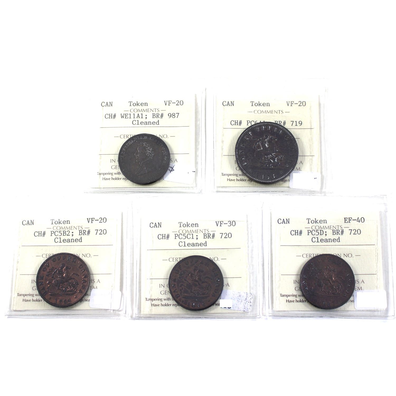 Lot of 5x 1812-1857 Canada Bank Tokens ICCS Certified VF-20 to EF-40. Includes 1812 Charlton WE11A1 (cleaned) VF-20, 1850 Charlton PC6A1 VF-20, 1852 Charlton PC5B2 (cleaned) VF-20, 1854 Charlton PC5C1 (cleaned) VF-30, and 1857 Charlton PC5D (cleaned) EF-40.