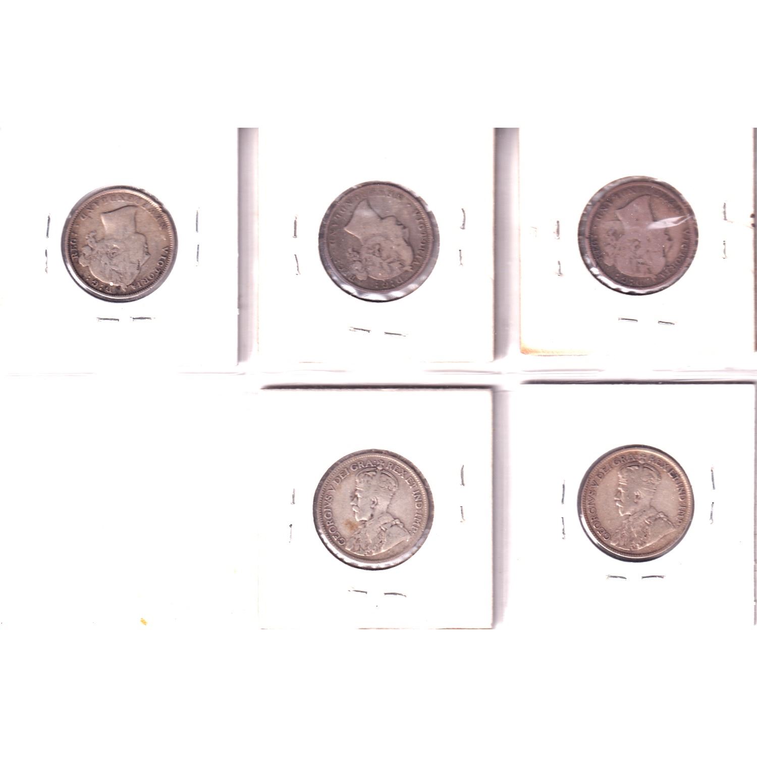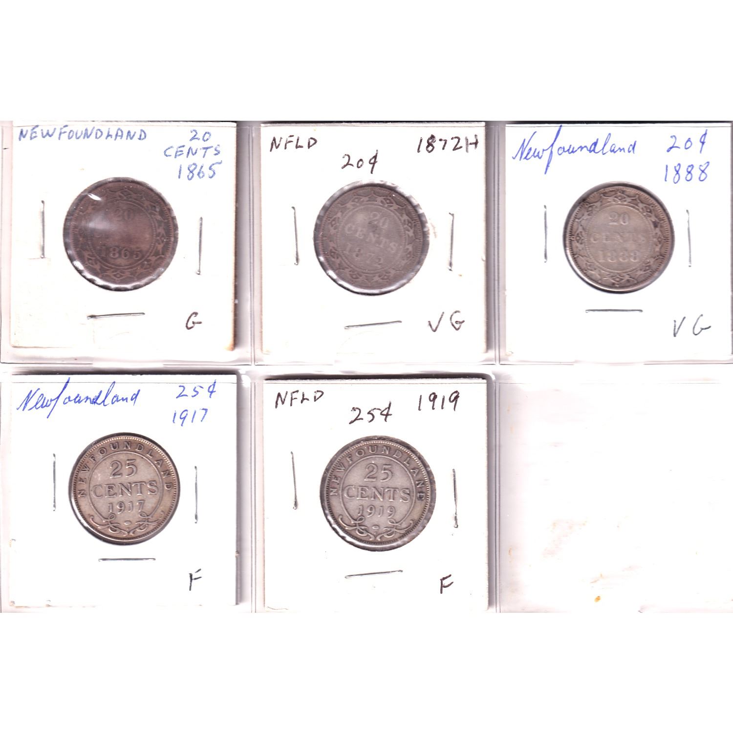 Lot of 5x 1865-1919 Newfoundland 20-cent Coins in F-VG Condition. Lot Includes: 1865 G; 1872H VG; 1888 VG; 1917 F; & 1919 F. Comes in 8-pocket sheet. Coins contain various imperfections. 5pcs.