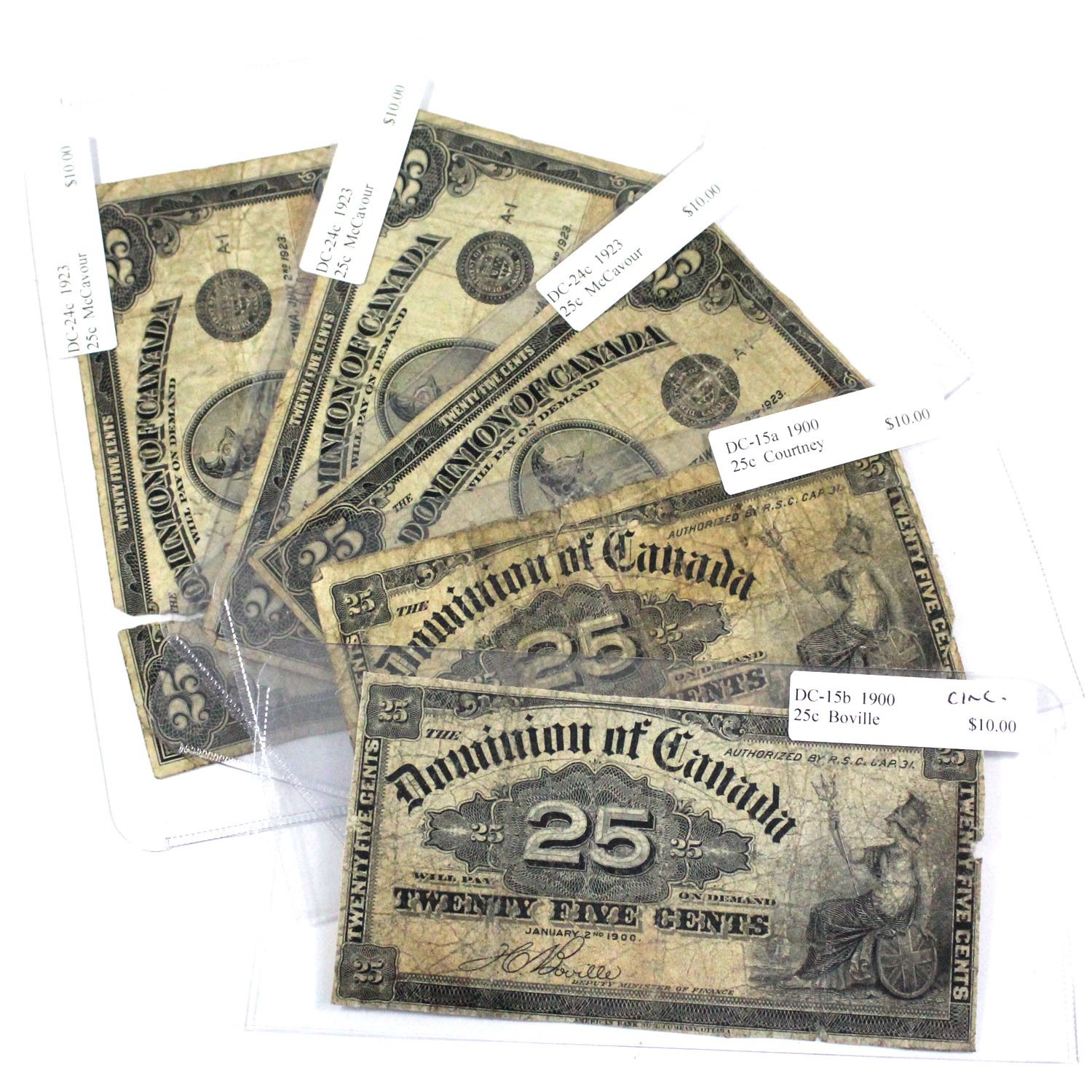 Lot of 5x 1900-1923 25-cent Shinplasters, Lot includes: DC-15b Circ, DC-15a Circ, DC-24c x3 all circ. Some may have pinholes and or tears. (5pc)