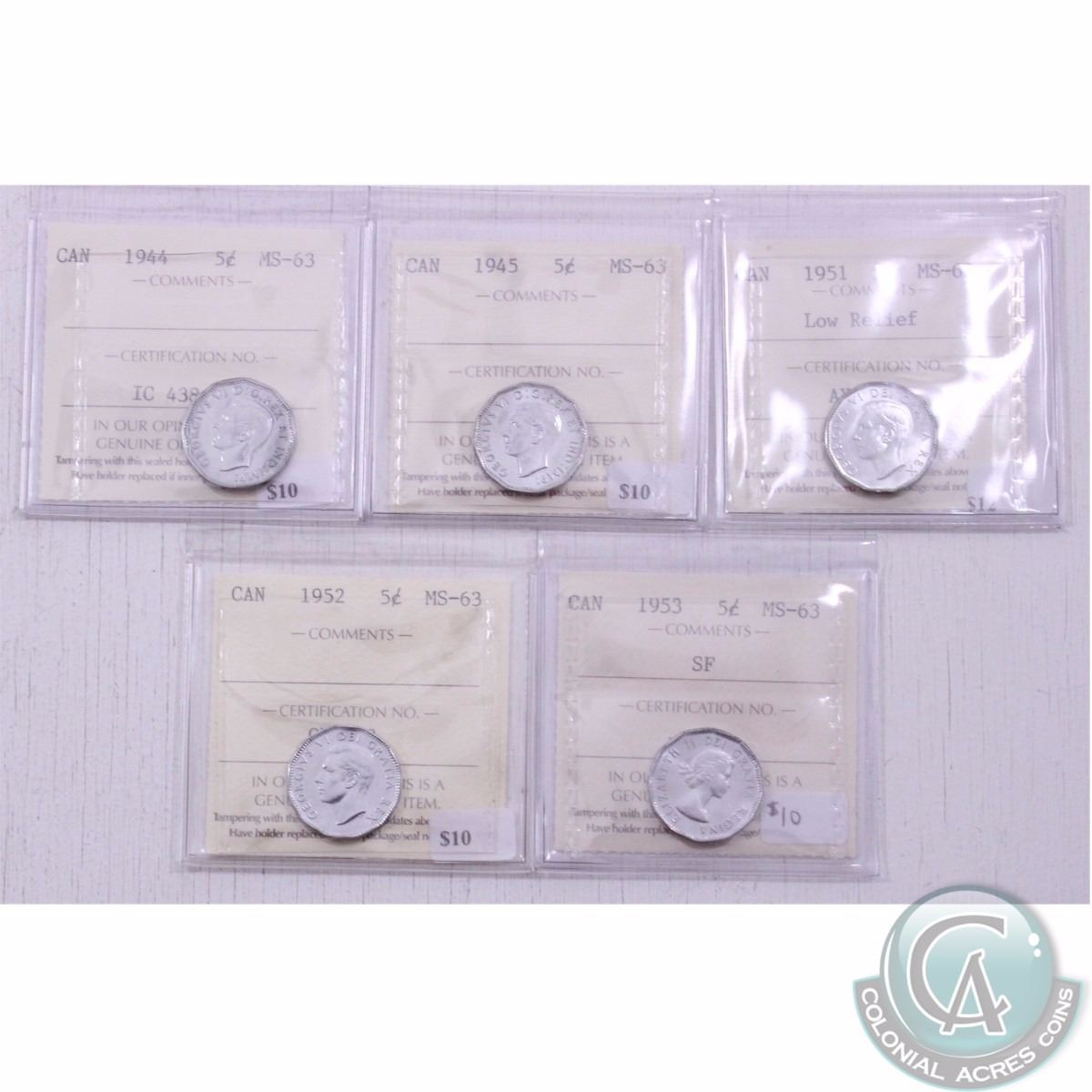Lot of 5x 1944-1953 Canadian 5-cent ICCS Certified coins in MS-63. The dates included in this lot are: 1944, 1945, 1951 Low Relief, 1952 and 1953 Shoulder Fold. (5pcs)