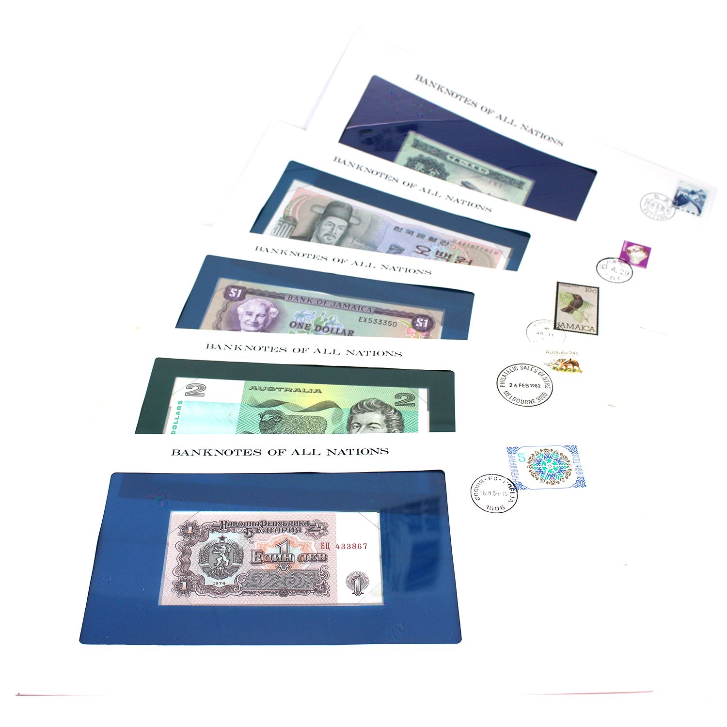 Lot of 5x Banknotes of All Nations. Lot Includes; 1953 People's Bank of China 2 Chinese Fen, 1974 Bulgaria 1 Lev, 1982 Australia $2, 1982 Jamaica $1, & 1983 South Korea 500 Won. Part of Franklin Mint's "Banknotes of All Nations" Subscription Series. Comes with stamped and sealed envelopes. Some envelopes show signs of yellowing and smudges.