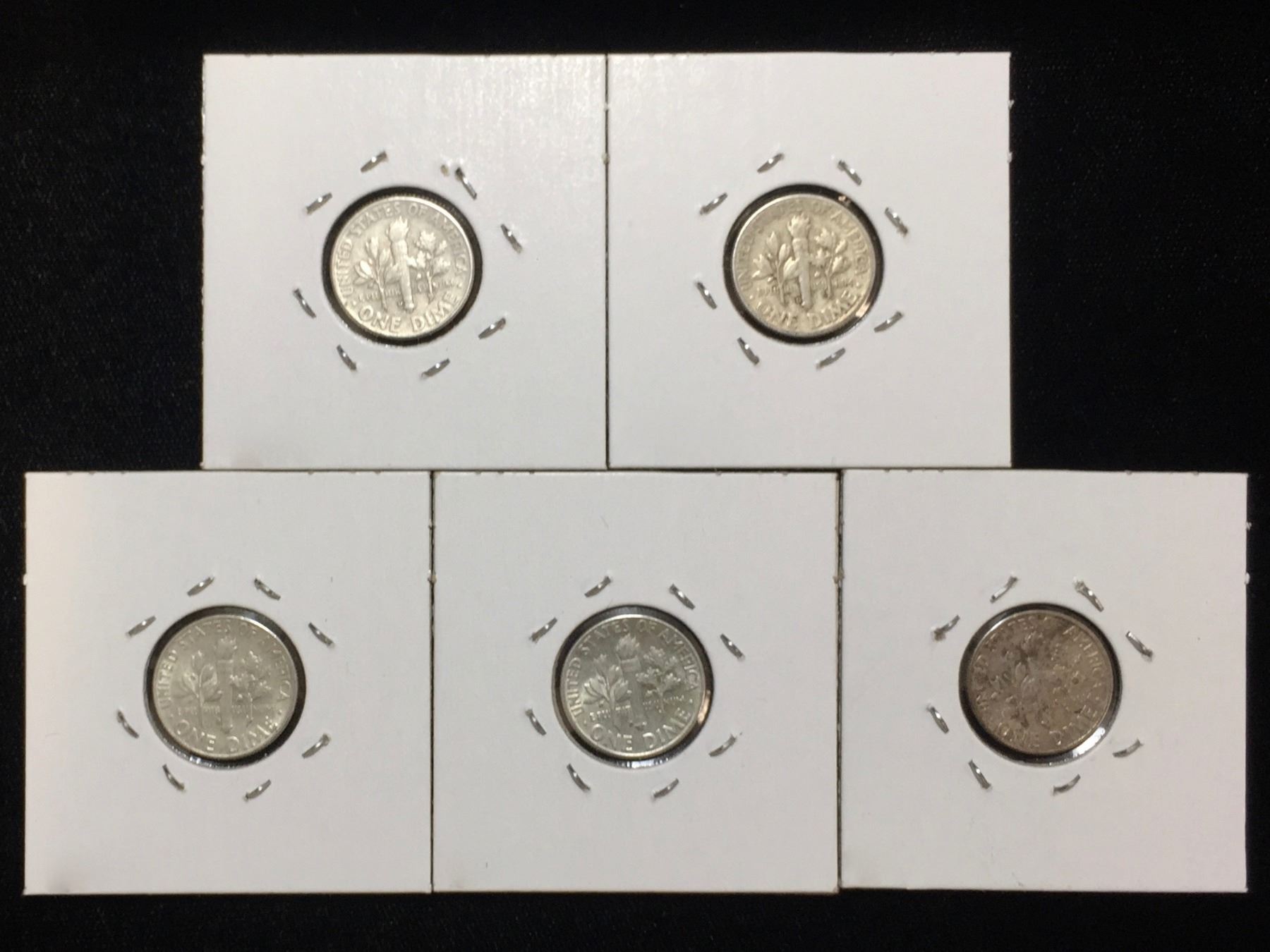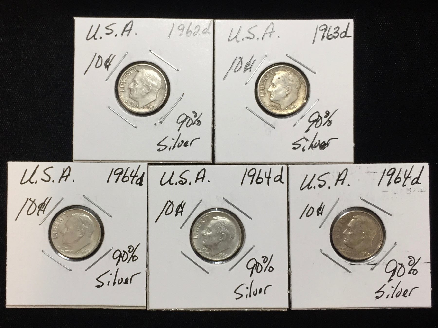 Lot 117; Lot of 5x US 10-Cents Silver Rosevelt Dimes, Dates Includes 1962, 1963, (3) 1964) Denver Mintmark, Silver .900, Condition as Pictured