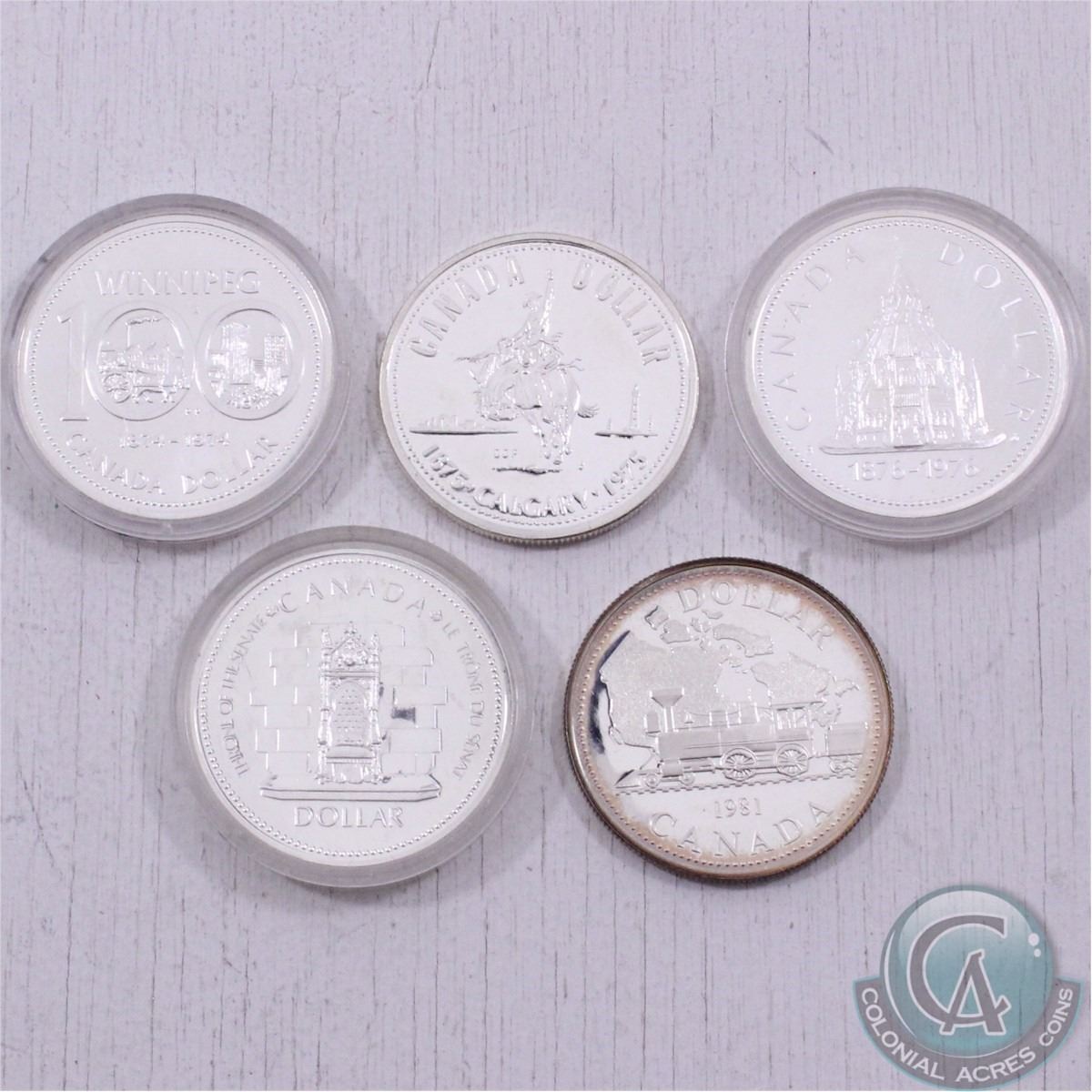 Lot of 5x 1974-1981 Canadian Commemorative Silver Dollars. The dates you will receive are: 1974, 1975, 1976, 1977 and 1981. Coins come encased in capsules with the exception of the 1975 and 1981 Silver Dollars. Capsules are scuffed and the coins contain natural toning. (5pcs)