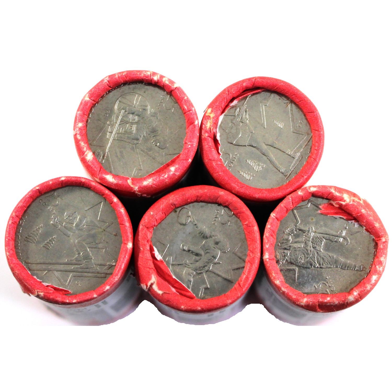 Lot of 5x 2007 Vancouver Olympics 25-cent Special Wrap Rolls. Includes Biathlon, Curling, Wheelchair Curling, Hockey, and Alpine Skiing. 5 Rolls. Lightly worn paper.