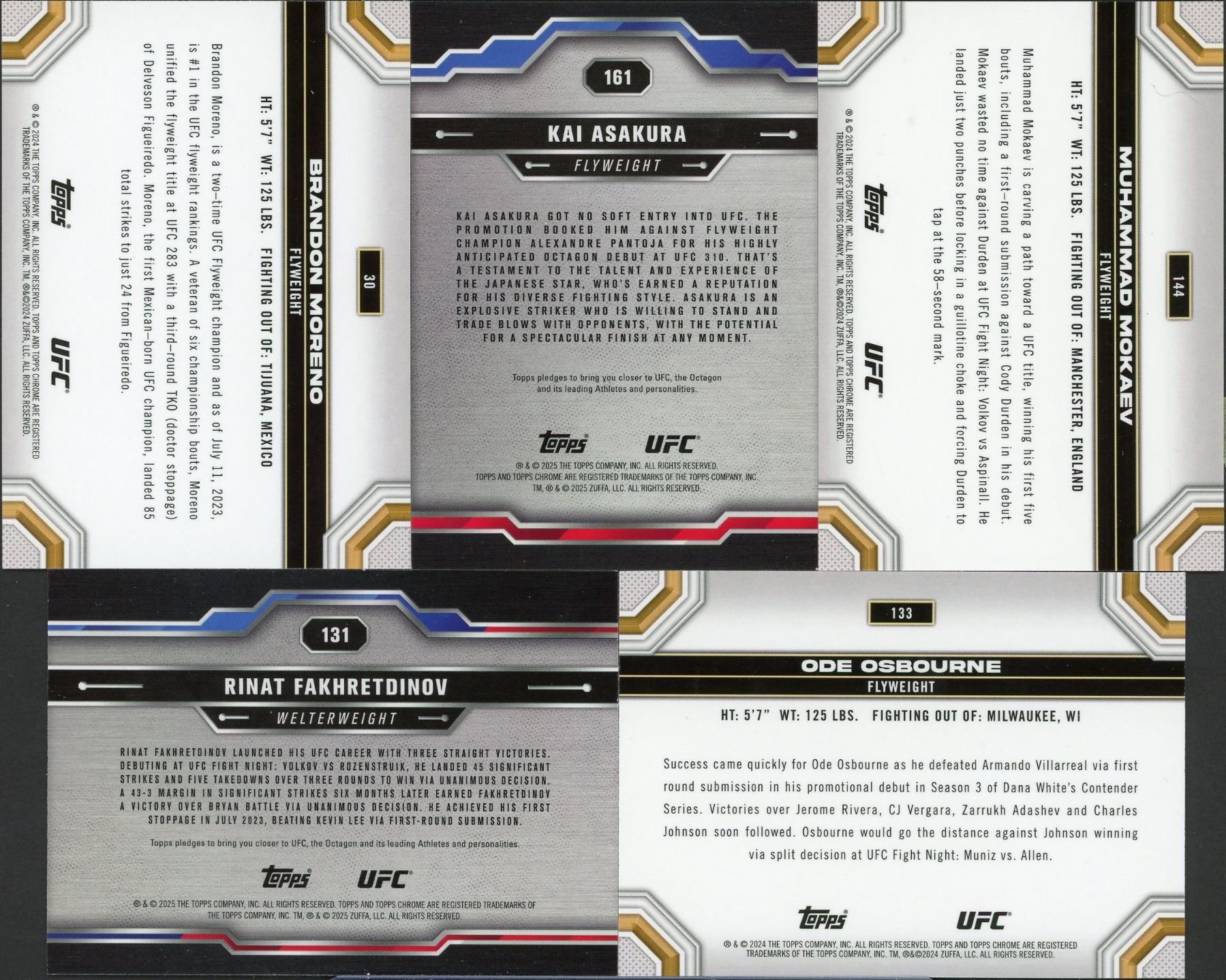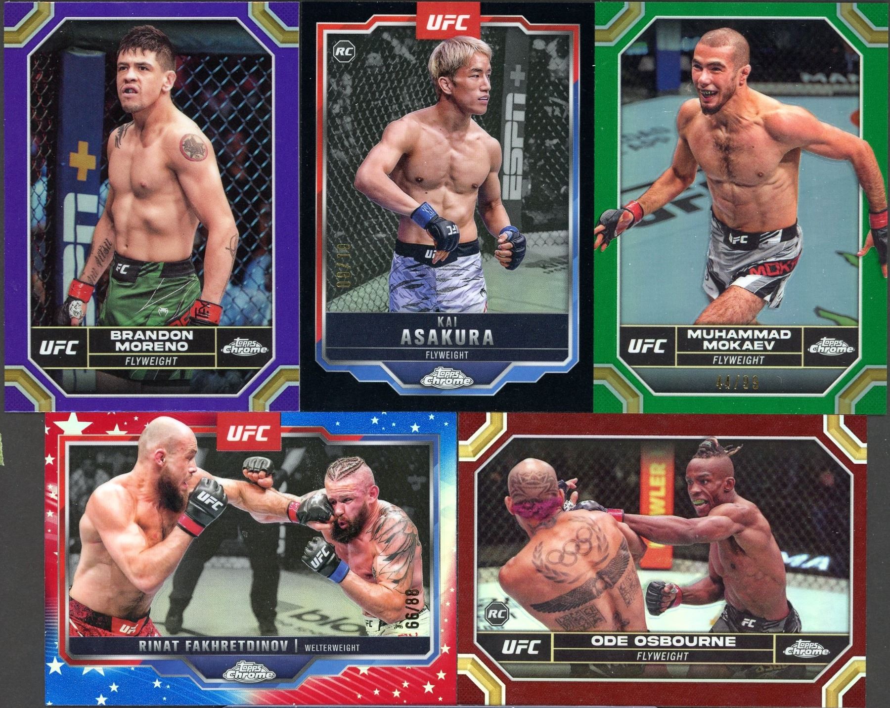 5 Card Topps Chrome UFC lot of parallels and #'d cards including top UFC fighters Brandon Moreno purple parallel, flyweight Kai Asakura #8/10 and more!