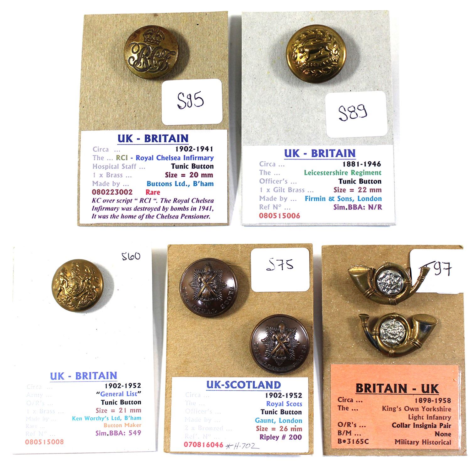 Lot of 5x Assorted Great Britain Buttons. Includes 2x King's Own Yorkshire Light Infantry Bugles, 2x Royal Scots Tunic Buttons, Royal Chelsea Infirmary, Leicestershire Regiment, and General List Tunic Button.