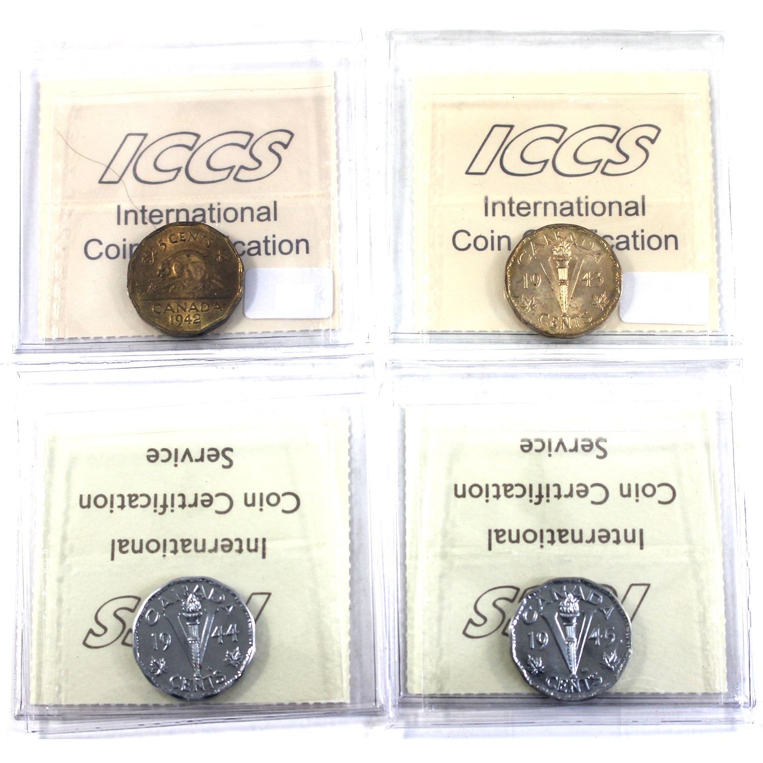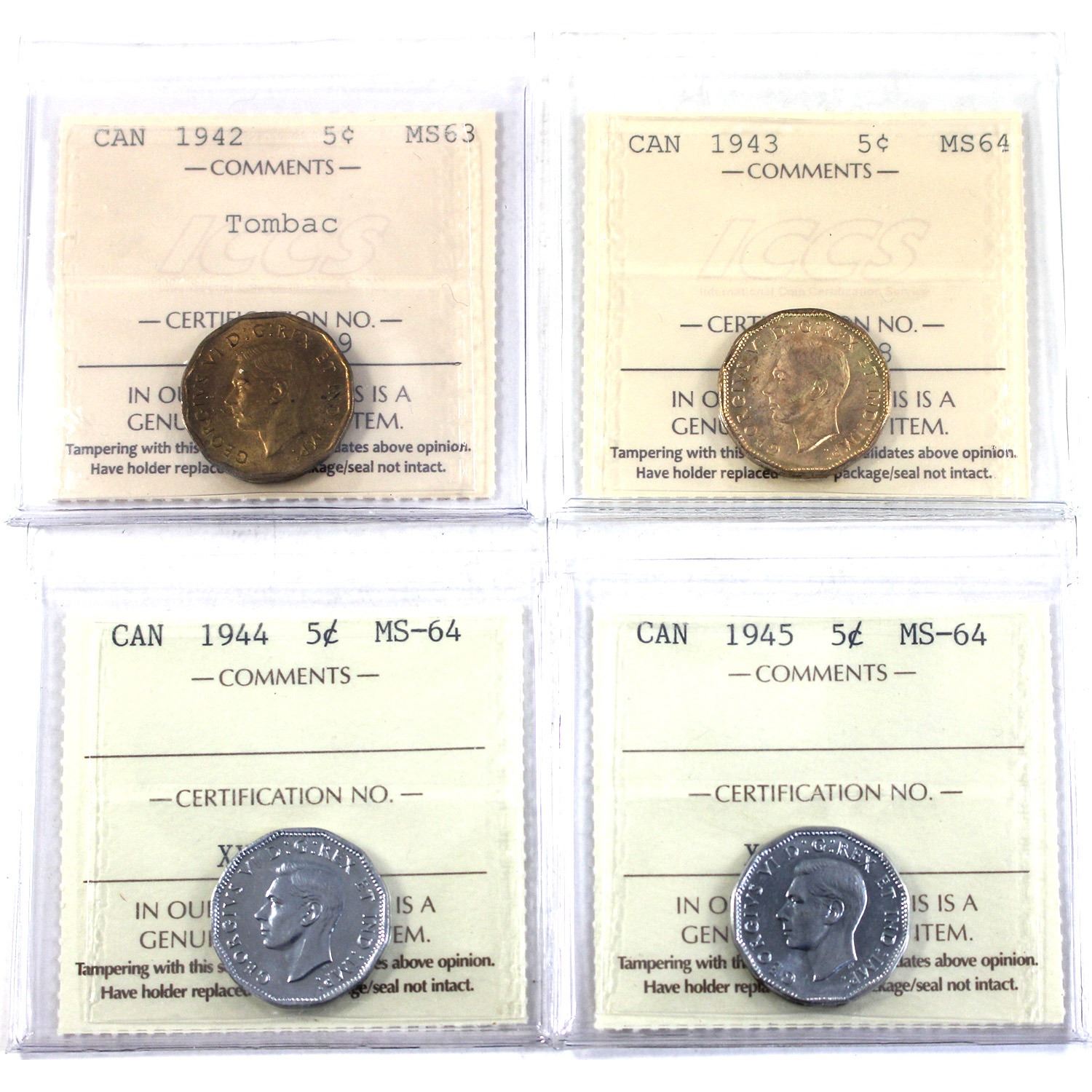 Lot of 5x Canada 5-cent ICCS Certified - 1942 Tombac MS63, 1943 MS64, 1944 MS64 & 1945 MS64. 4pcs