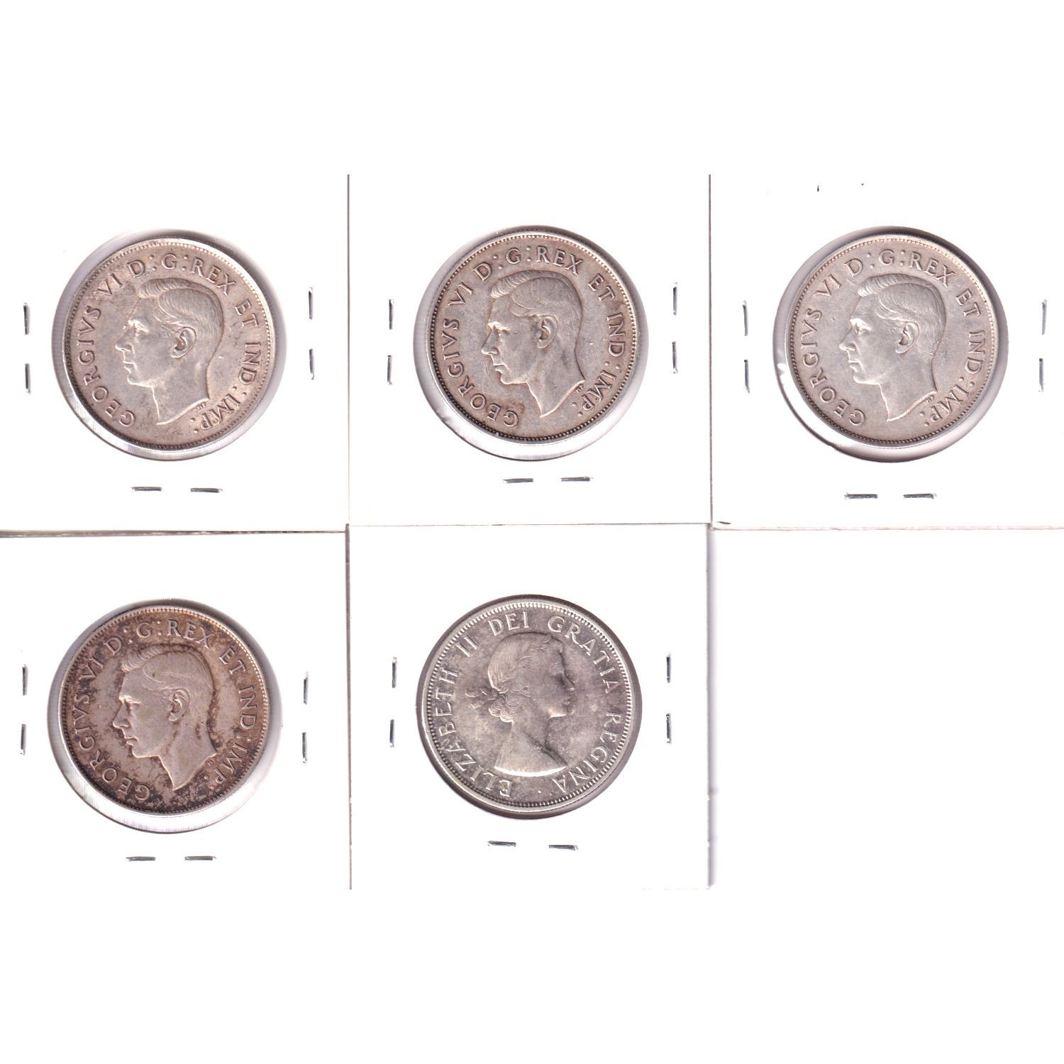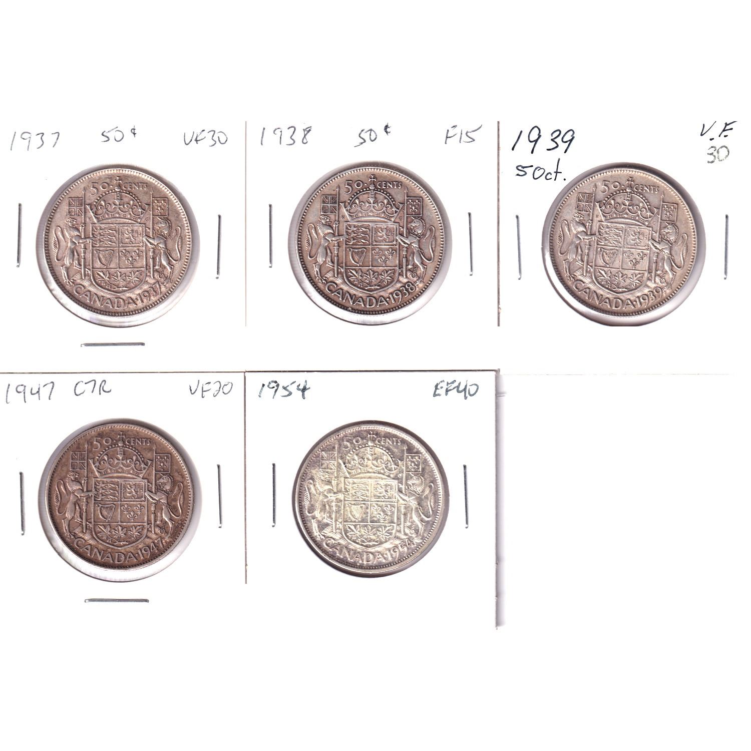 Lot of 5x Canada 50-cent coins: 1937 VF-30, 1938 F-15, 1939 VF-30, 1947 C7R VF-20 & 1954 EF-40. 5pcs