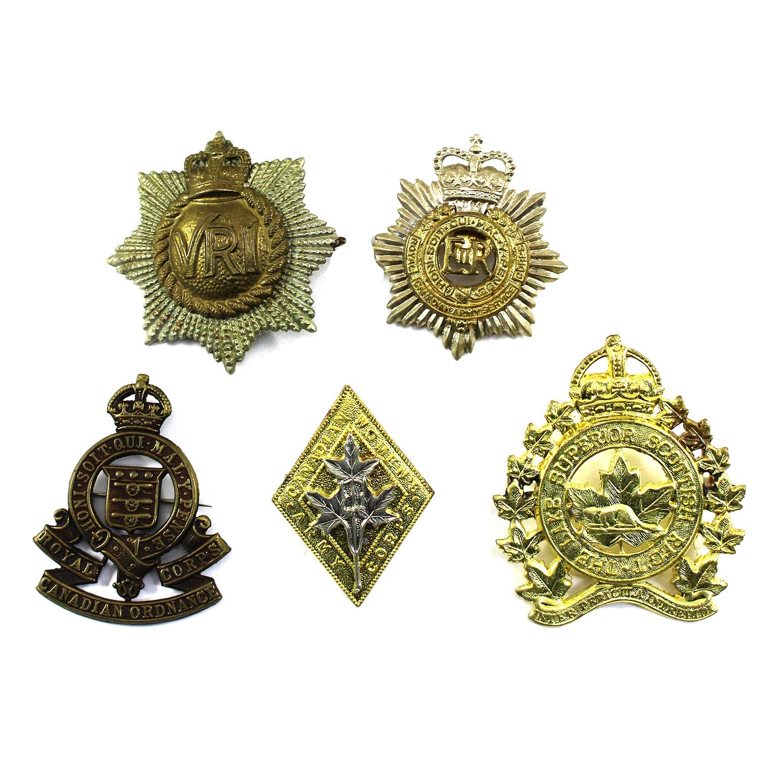 Lot of 5x Canada Military Badges. Includes Royal Canadian Army Service Corps cap badge, Royal Canadian Ordnance Corps cap badge, Canadian Women's Army Corps cap badge, Lake Superior Scottish Regiment cap badge, and the Royal Canadian Regiment cap badge.