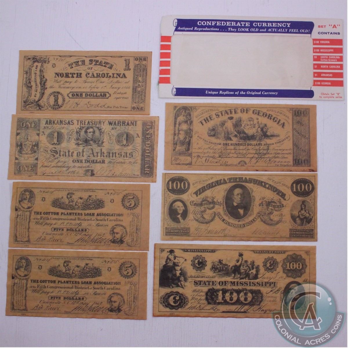 Lot of 5x Confederate States of America currency, Series A Bank Notes(replica play money). This set contains the following replica currency: North Carolina State $1, Arkansas State $1, 2x District of south Carolina Cotton Planters loan association  $5, Georgia state $100,  Virginia treasury $100 and the State of Mississippi $100 note.
