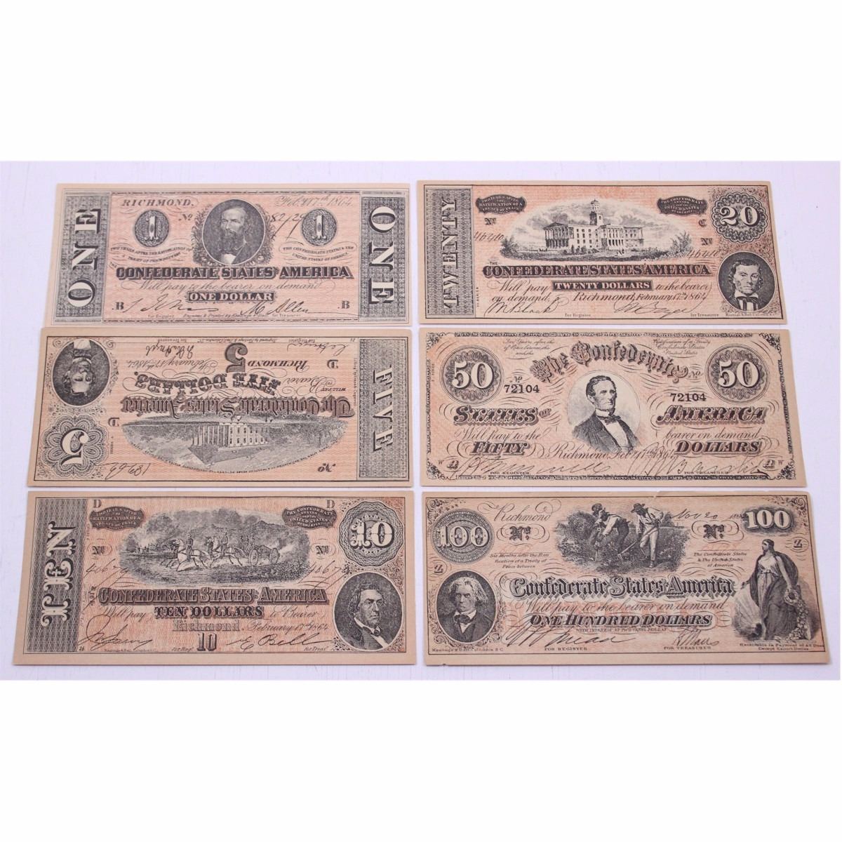 Lot of 5x Confederate States of American $1, $5, $10, $50 & $100 Bank Notes(replica play money)