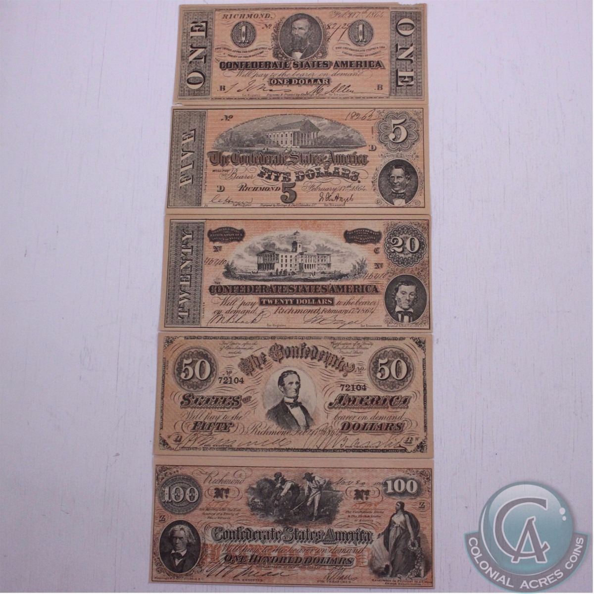 Lot of 5x Confederate States of American $1, $5, $20,$50 & $100 Bank Notes(replica play money)