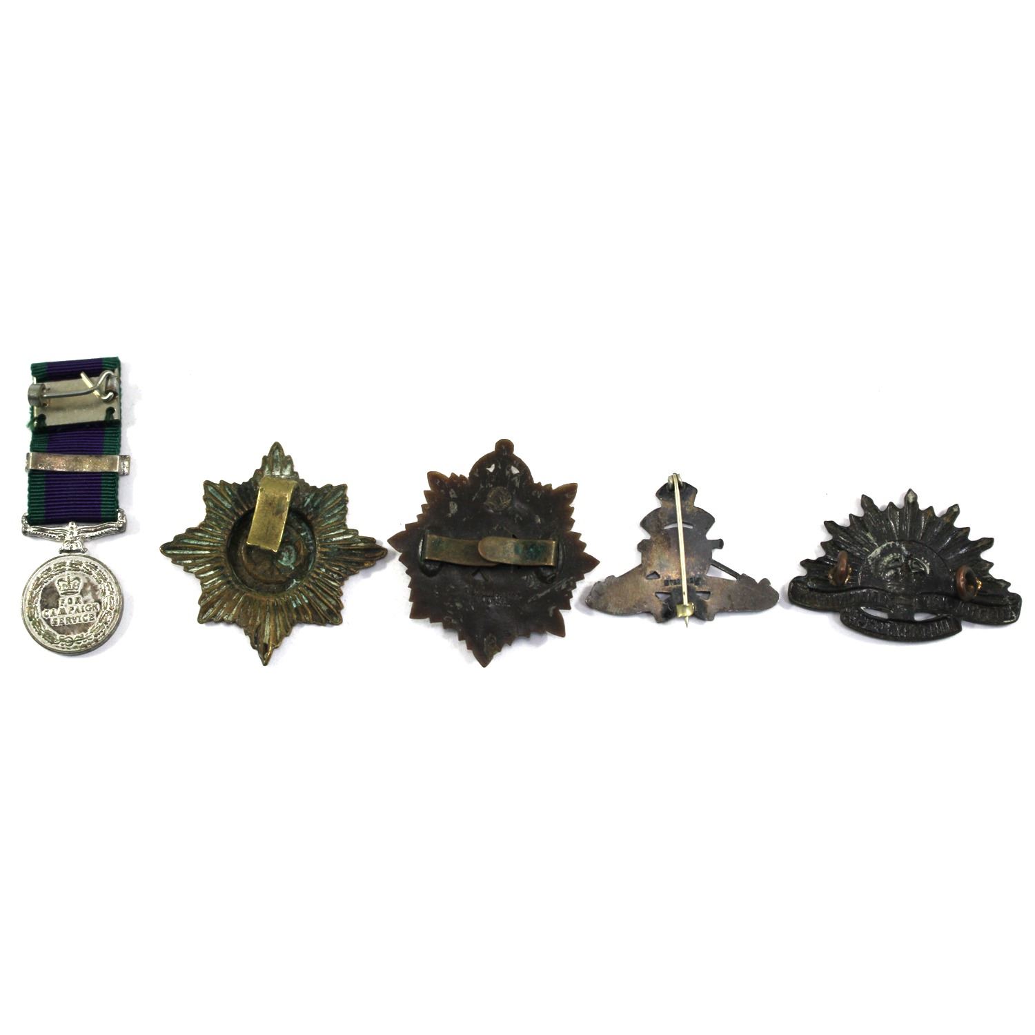 Lot of 5x International Badges. Includes Northern Ireland For Campaign Service Mini Medal, Irish Guards Regiment Cap Badge, UK Royal Army Service Corps Cap Badge, UK Royal Artillery Enamel Pin, and Australia Commonwealth Military Forces Cap Badge. Items may have some age related corrosion.