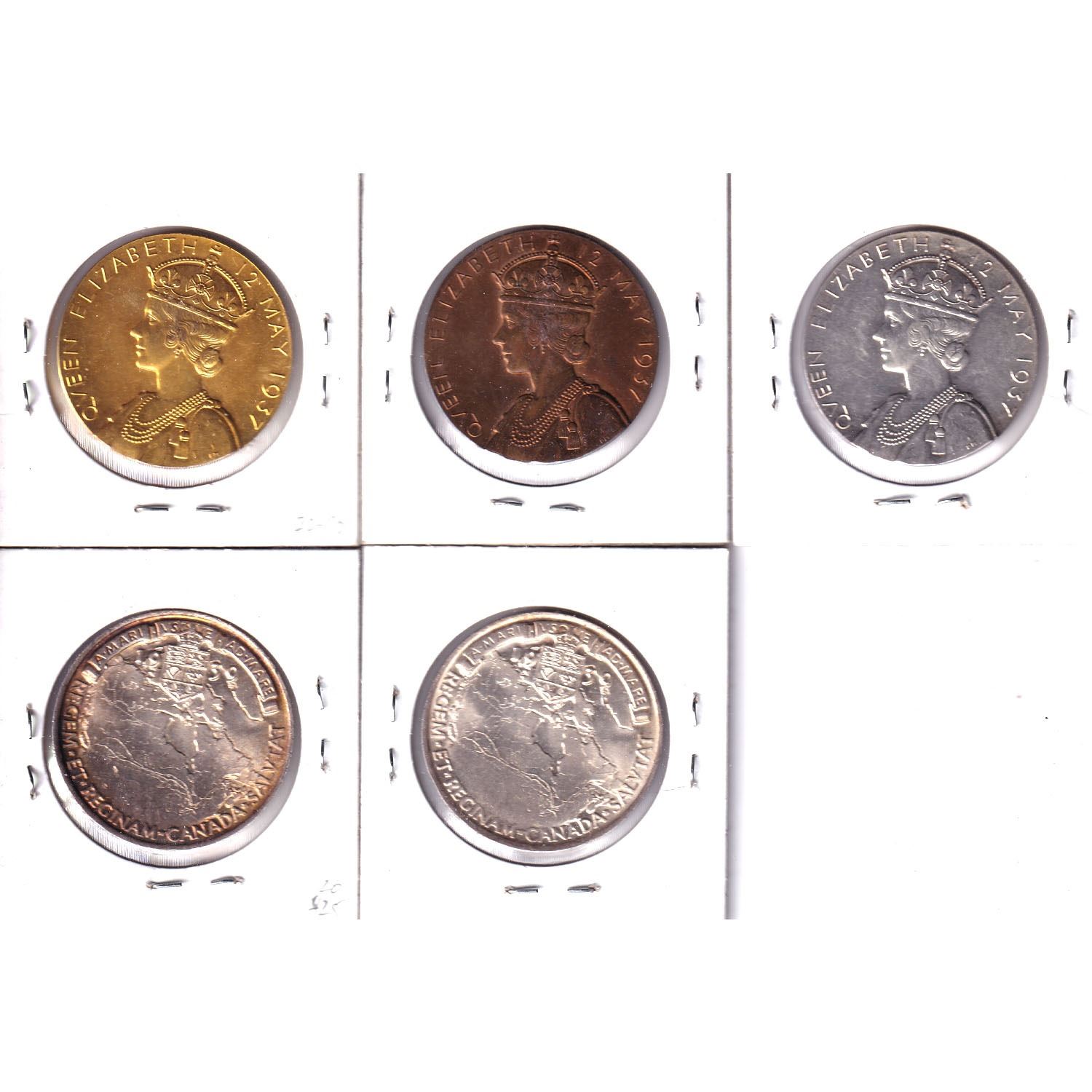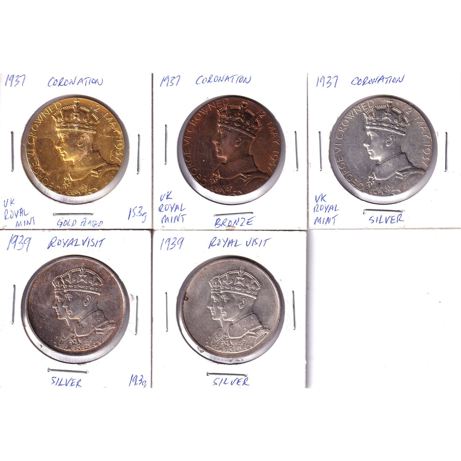 Lot of 5x King George 6th Medals. Lot includes: 3x Coronation strikes in Silver, Bronze & Gold Plated, and 2x Silver 1939 Royal Visit Medals. 5pcs