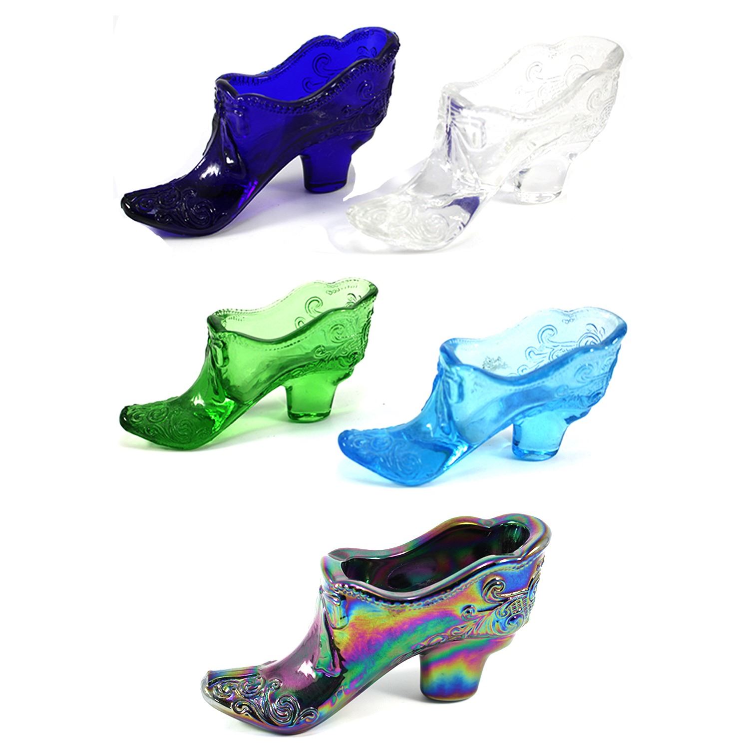 Lot of 5x Mosser Glass Company Glass Slippers with Bows and Decoration All Different Colours - Green, Ice Blue, Cobalt Blue, Clear White & Rainbow Marble. 5pcs