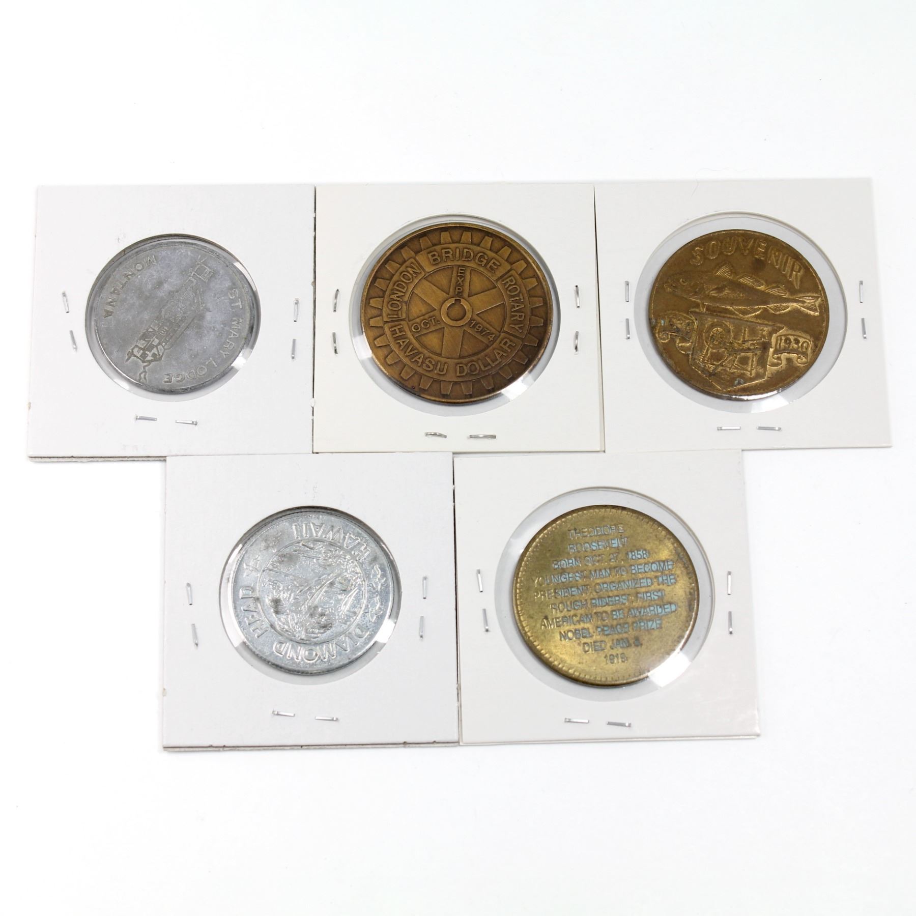 Lot of 5x USA Commemorative Tokens. Includes Oceania Floating Restaurant Hawaii, 1630-1930 Massachusetts Bay Colony, 1974 Lake Havasu Arizona Rotary Club, 1901-1909 Theodore Roosevelt 26th US President, and St. Mary Lake Glacier Montana Good Luck Token. Various imperfections.