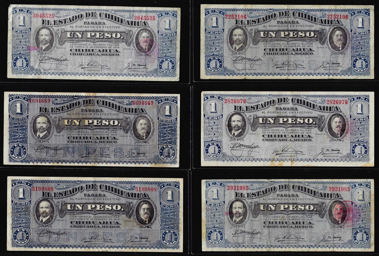 Lot of (6) 1915 1 Peso Mexico Revolutionary State of Chihuahua Notes