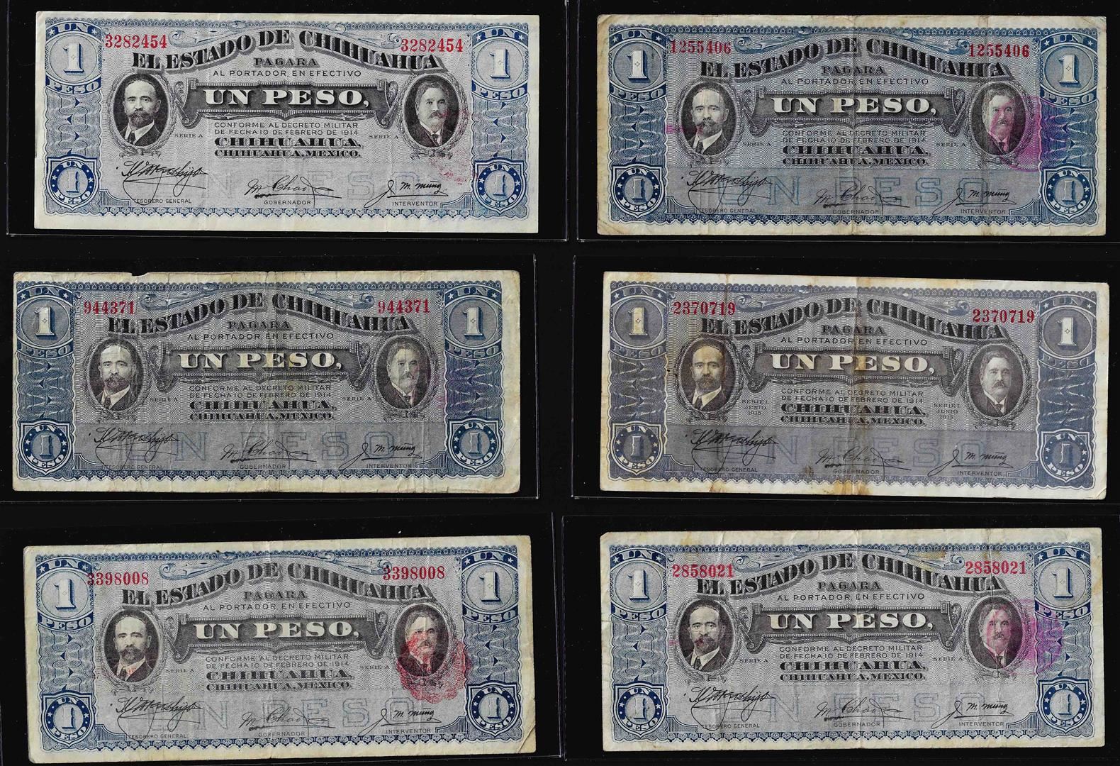 Lot of (6) 1915 1 Peso Mexico Revolutionary State of Chihuahua Notes