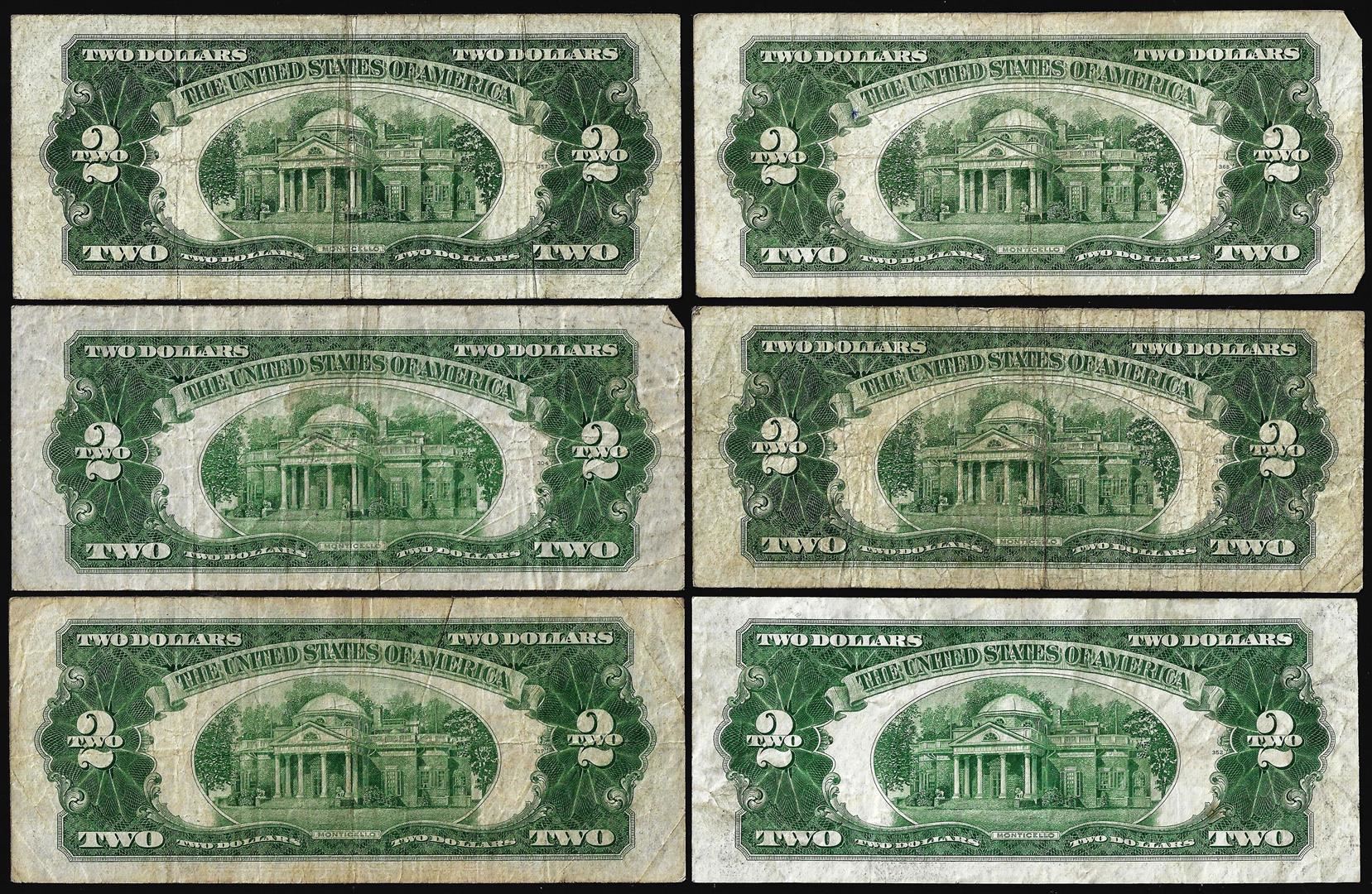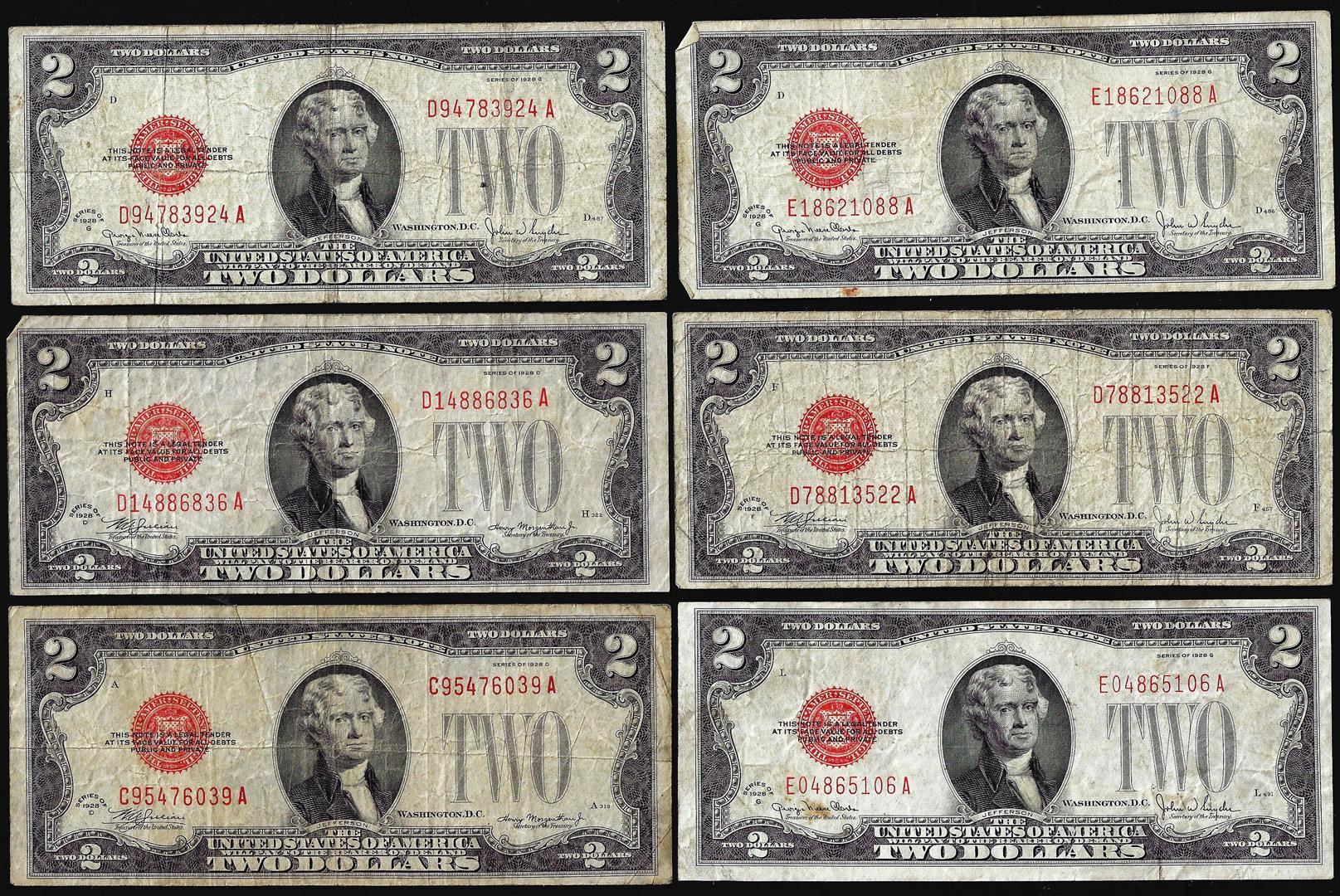 One Lot of (6) 1928D/F/G $2 Legal Tender Notes.