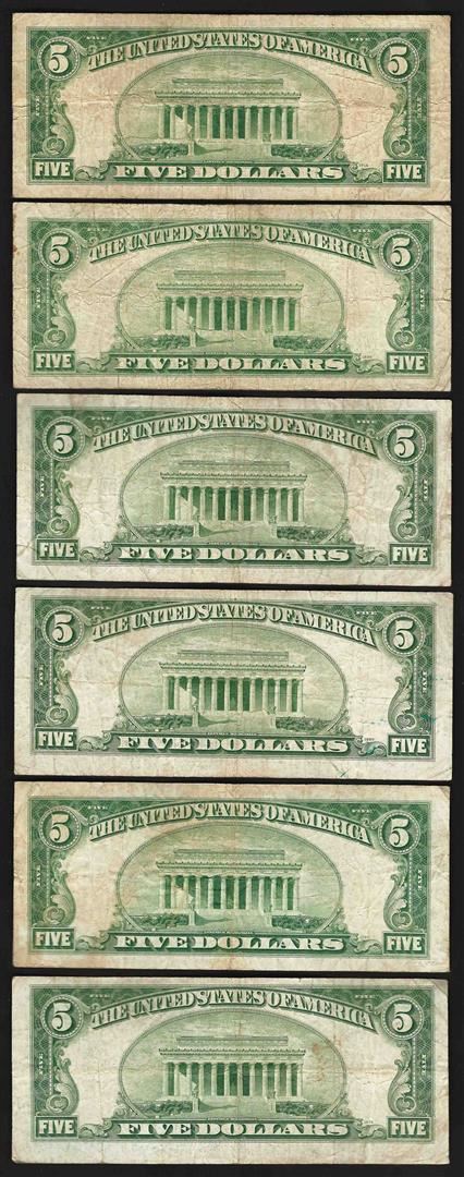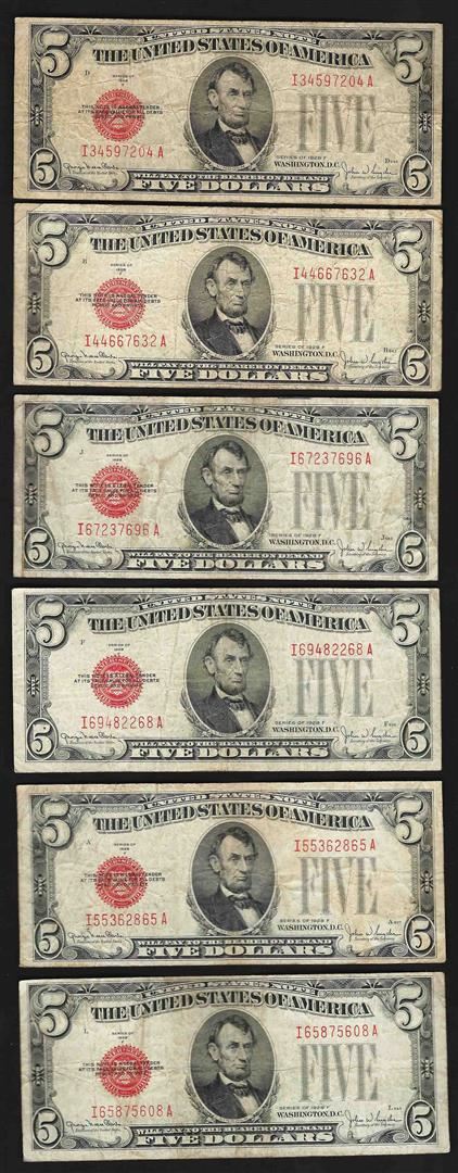 One Lot of (6) 1928F $5 Legal Tender Notes.