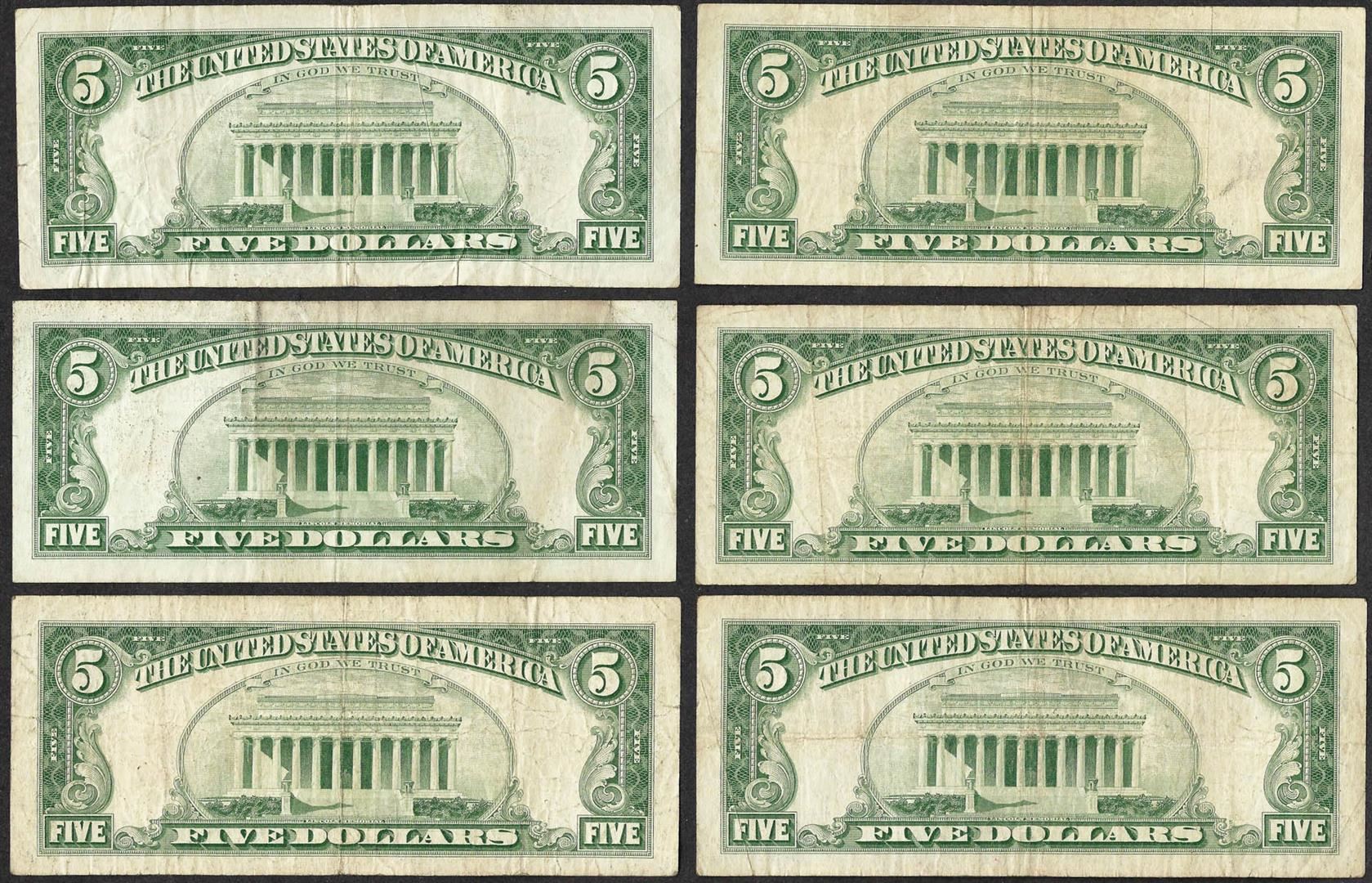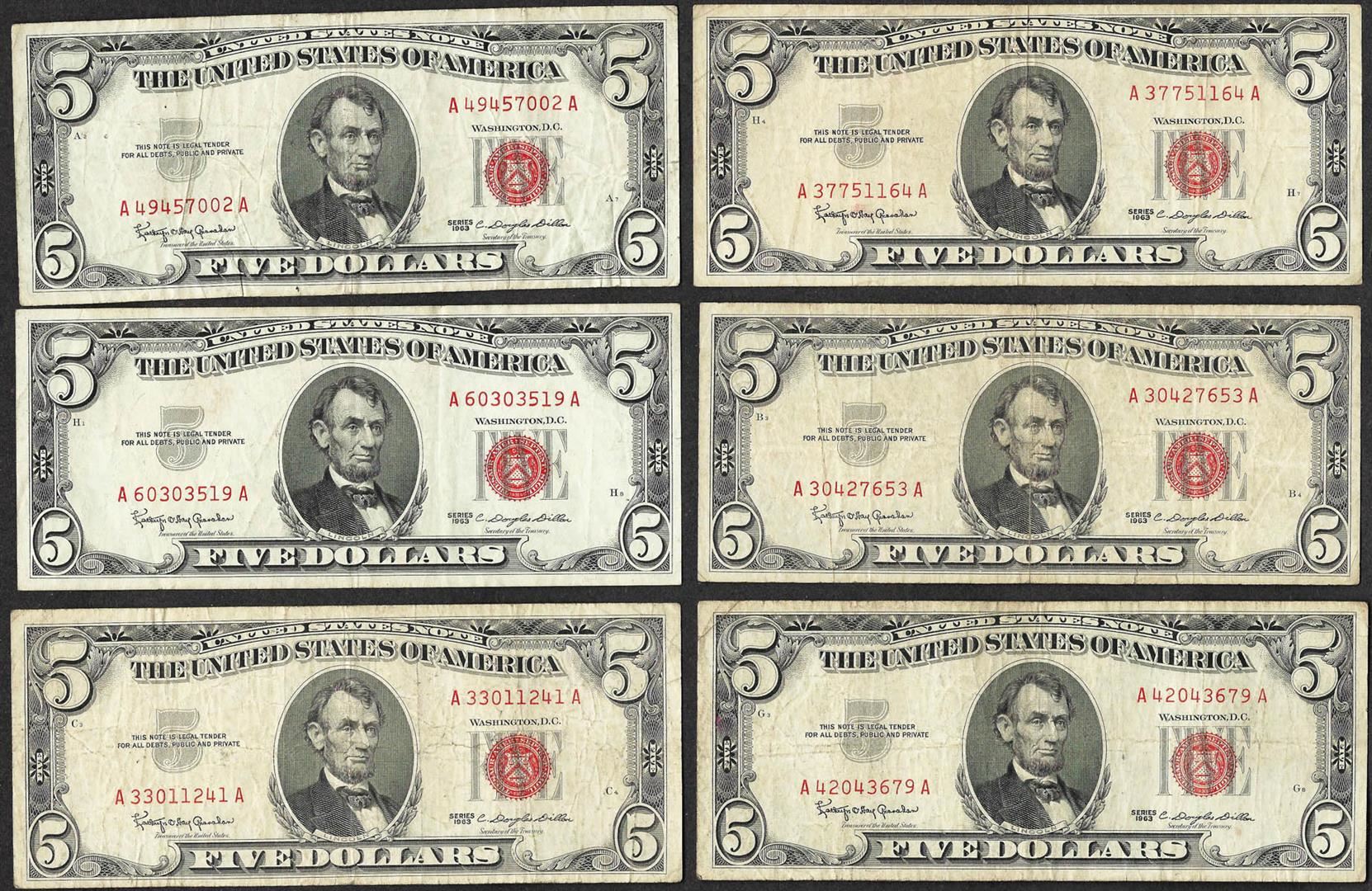 One Lot of (6) 1963 $5 Legal Tender Notes.