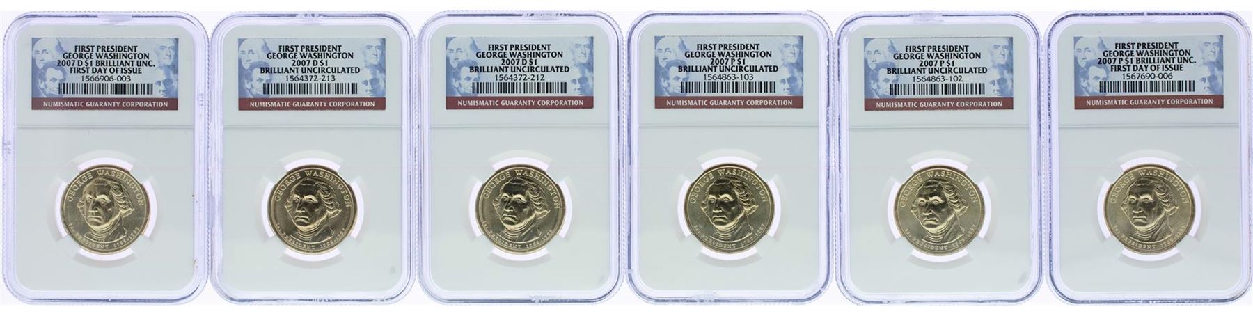 One Lot of (6) 2007 George Washington Presidential Dollar Coins NGC Brilliant Uncirculated. NGC Certified.