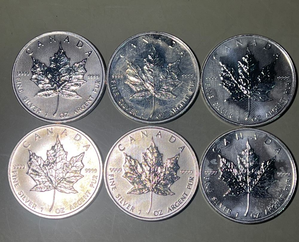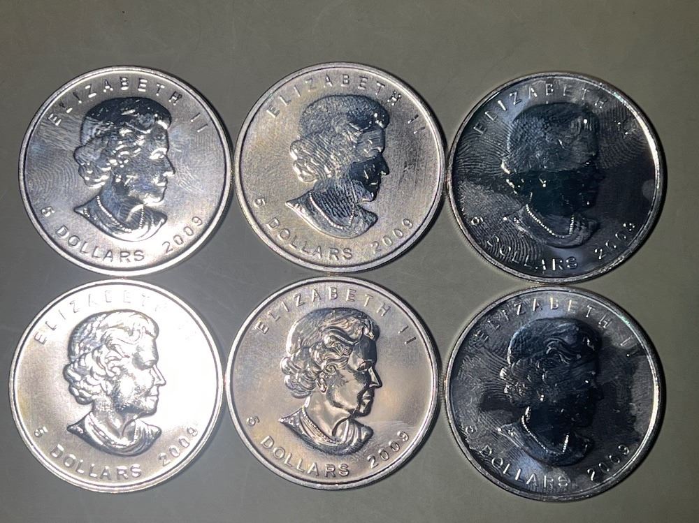 Lot of 6 - 2009 $5 Canadian Maple, 1oz, 0.999 Fine Silver Rounds