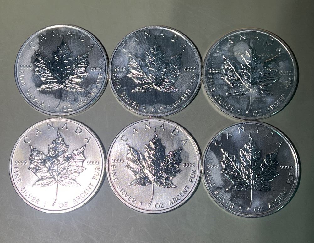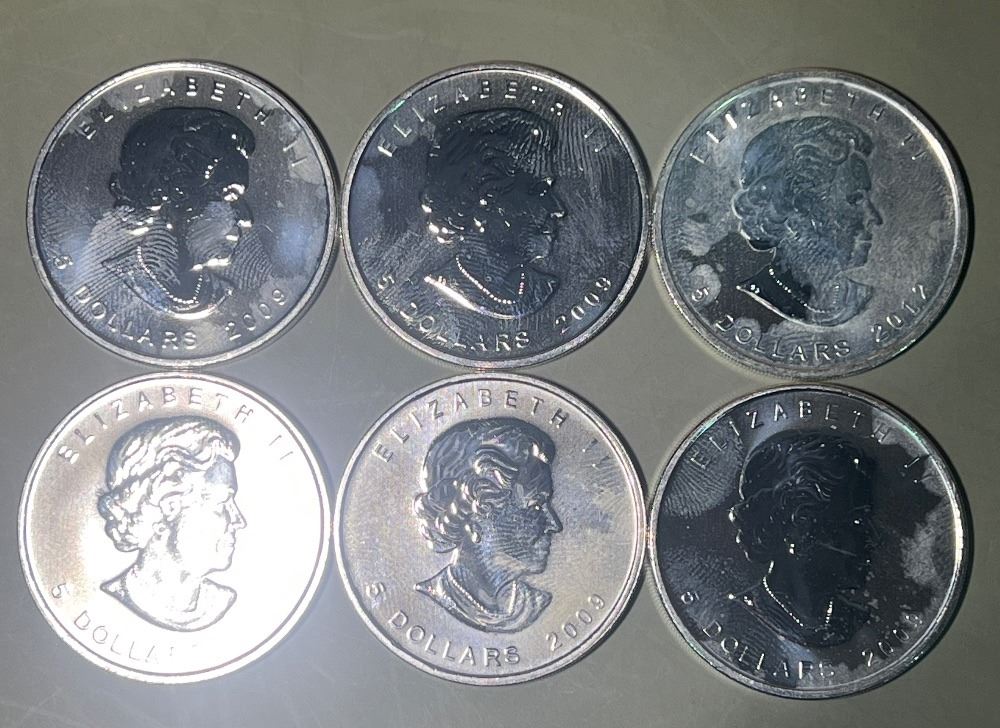 Lot of 6 - 2009 $5 Canadian Maple, 1oz, 0.999 Fine Silver Rounds