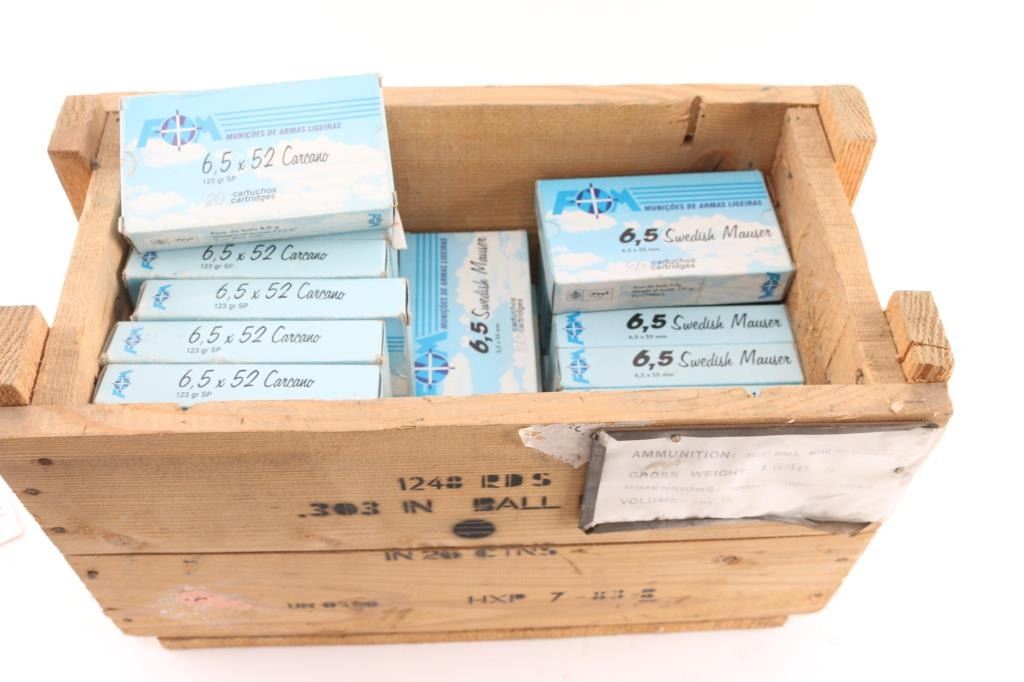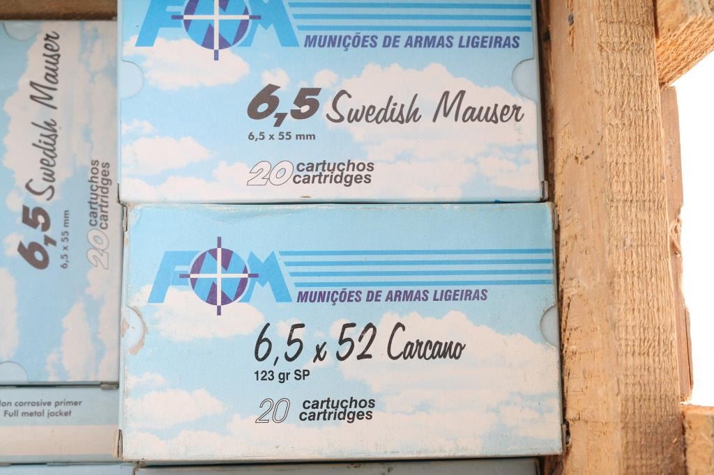 Approx. 640 rounds of 6.5 X 55 Swedish Mauser & 160 rounds 6.5 X 52 Carcano factory new ammunition. 139 Gr. FMJ & 123 Gr. SP respectively. All In boxes of 20 and 1 wooden crate. Approx. 51 LBS.