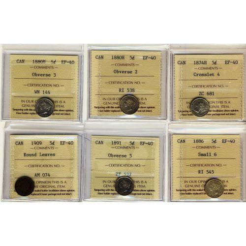 Lot of 6 5¢ coins all ICCS EF40. Includes 1874H Croolet 4, 1880H Obv 2, 1880 Obv 3, 1886 Sml 6, 1891 Obv 5 and 1909 RL.