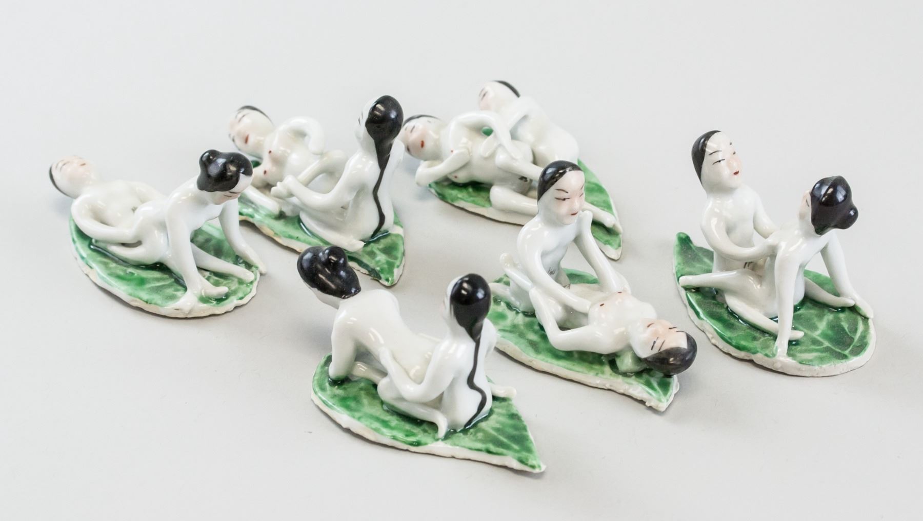 Lot of six Chinese porcelain figures. In different positions. With white porcelain bodies and green leaves. 4.5 x 8 cm (each approximately), 305 grams (each).