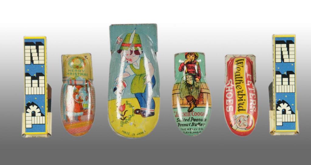 1930s to 1950s. Lithographed tin. Includes two Pez, Weatherbird Shoes, Jackie Coogan, Santa, and elf watering plants. Collection of Carl Lobel. Condition (Excellent). Size Largest: 3" L.