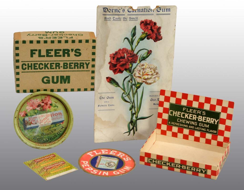Description 1910 to 1930s. Includes one Dorne’s Gum tip tray, one Dorne’s Carnation Gum sign, one Checkerberry Gum wrapper, one Fleer’s Pepsin Gum fan pull, and one Checkerberry Gum box. Fading and staining throughout with overall wear. Condition (Fair - Excellent).