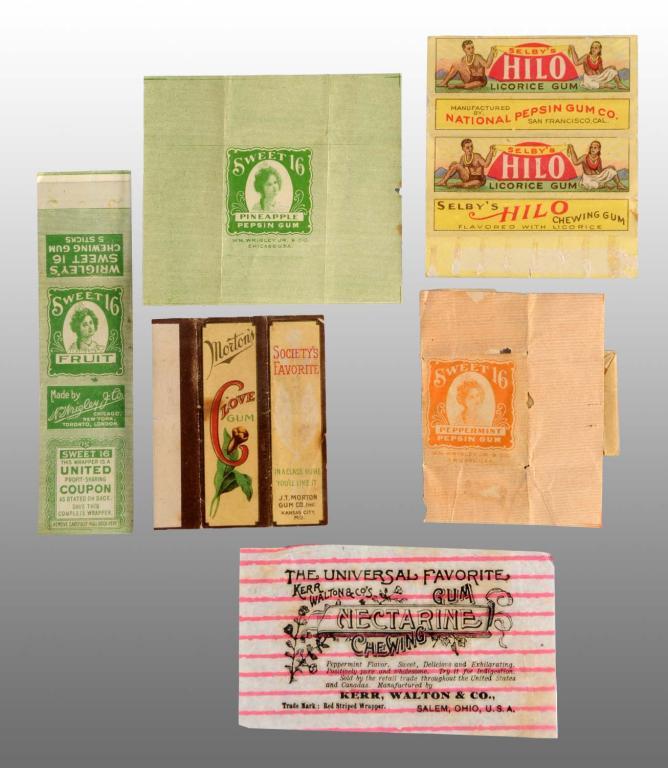 Description Includes Nectarine Chewing Gum, Morton's Clove Gum, Hilo, and Sweet 16 Fruit Gum. Some general staining and overall wear in various sizes. Condition (Very Good - Excellent).