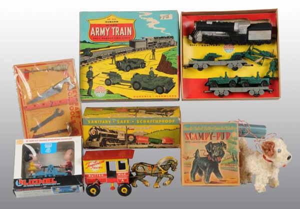 Description Includes one battery-operated puppy toy, one rubber Army train set, one rubber domestic train set, one tool set, one Marx Toy Town wind-up toy, and one Lucy and Charlie Brown Lionel handcar. Four original boxes are included. Condition (Very Good - Excellent).