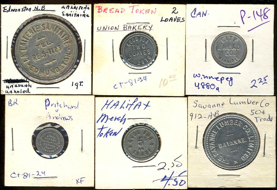 Lot of 6 Bakery tokens. Winnipeg, Edmunston, NB, Halifax, NS, Ottawa, Ontario.