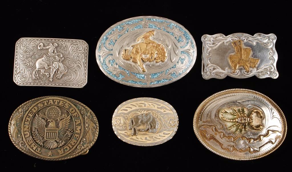 Including: (1) Brass with eagle and U.S. Crest that reads "The United States of America" from the Tony Llama Collection State Series. (1) Silver metal scrolled rectangle with gold tone saddle in the center. (1) Silver metal rectangle with engraved swirls and flowers behind a cowboy on a bucking bronco. (1) Large silver metal oval with turquoise inlay, leaf design and cowboy with bucking bronc in gold tone in the middle. (1) Silver tone oval with raised scorpion in center with gold metal accents. (1) Small oval with engraved and floral design with gold tone accents and bucking bronco in the middle.