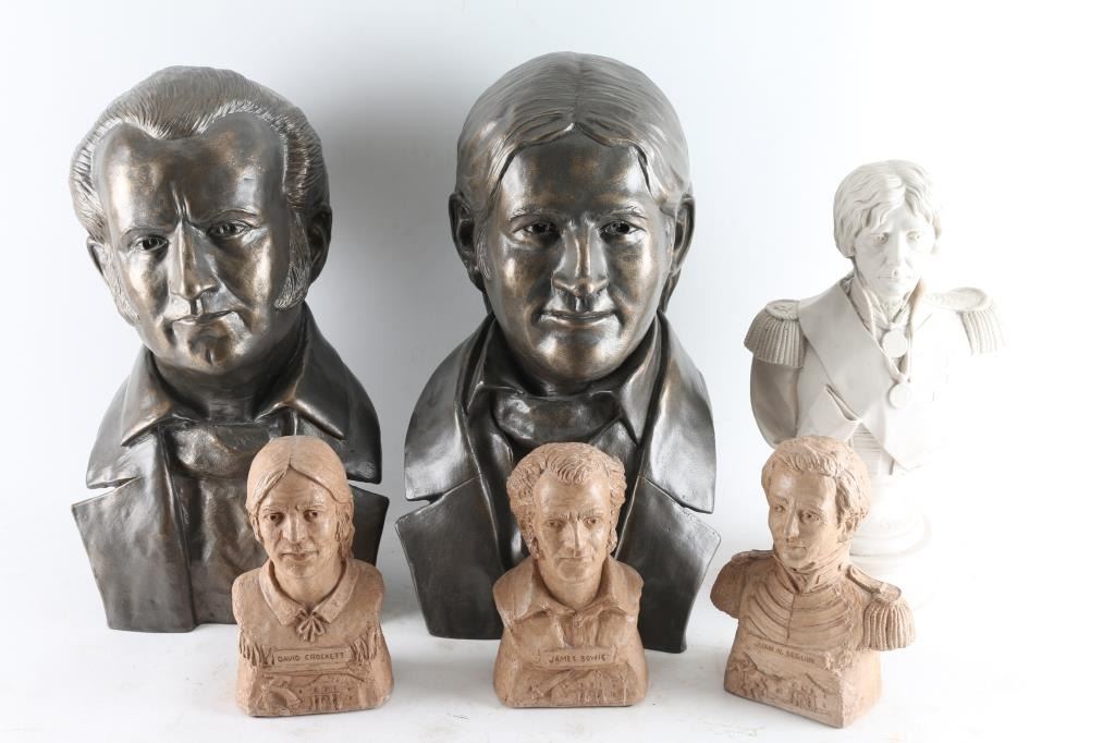 Two made of plastic, approximately 17" tall, James Bowie and Davey Crocket, and three related to Texas history, James Bowie, David Crocket, and Juan M. Sequin, approximately 8" tall from a plaster and light brown colored, lastly Nelson, from a white resin approx. 14". From the Estate of Joseph Musso Collection.