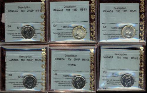 Lot of 6 CCCS graded Ten cents; 1963 (2), 1999, 2002P, 2003P Old effigy, 2004P. All MS65.