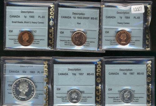 Lot of 6 CCCS graded coins. 1 cent 1964 PL-65 Heavy Cameo, 1952-2002 P MS-65 red, 1965 SB Blunt 5 PL-65 Heavy cameo, 10 cents; 1957 MS-65, 1967 MS-65 50 cents; 1963 PL-66 Heavy cameo.