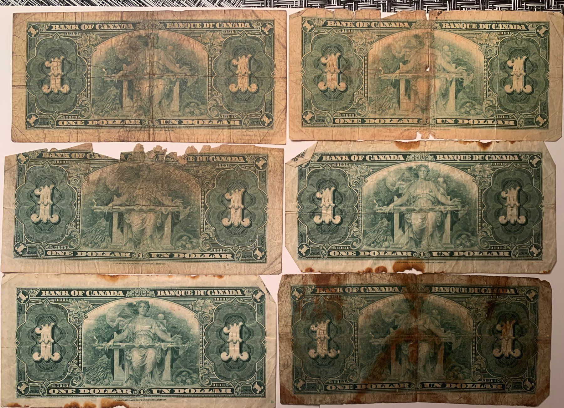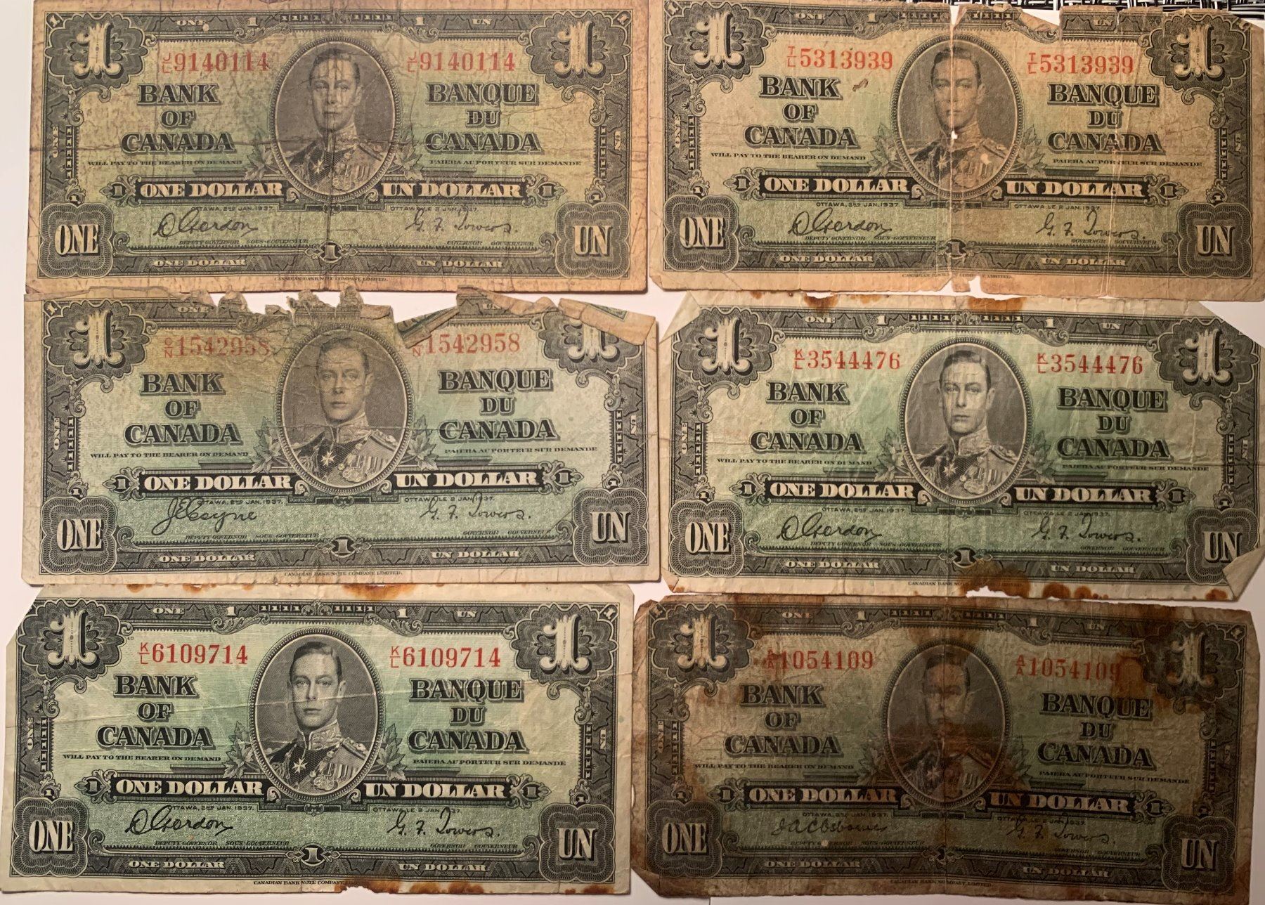 Lot of 6 Canada 1 Dollar 1937 Bank of Canada $1 Damaged Circulated